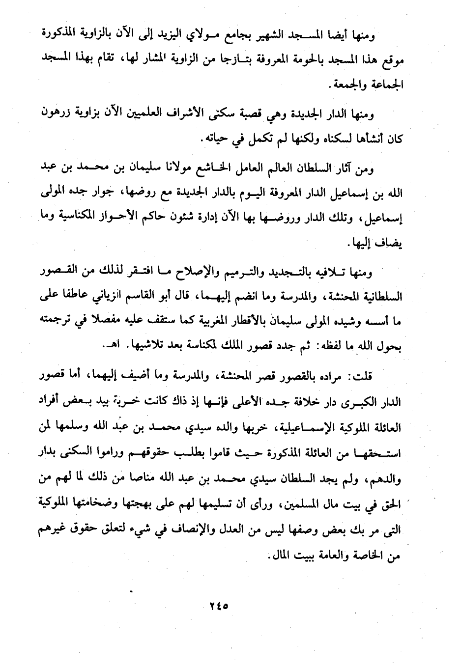 قلت: مراده بالقصور قصر المحنشة، والمدرسة وما أضيف إليهما، أما قصور الدار الكبرى دار خلافة جده الأعلى فإنها إذ ذاك كانت خربة بيد بعض أفراد العائلة الملوكية الإسماعيلية، خربها والده سيدي محمد بن عبد الله وسلمها لمن استحقها من العائلة المذكورة حيث قاموا بطلب حقوقهم وراموا السكنى بدار والدهم، ولم يجد السلطان سيدي محمد بن عبد الله مناصا من ذلك لما لهم من الحق في بيت مال المسلمين، ورأى أن تسليمها لهم على بهجتها وضخامتها الملوكية التي مر بك بعض وصفها ليس من العدل والإنصاف في شيء لتعلق حقوق غيرهم من الخاصة والعامة ببيت المال.