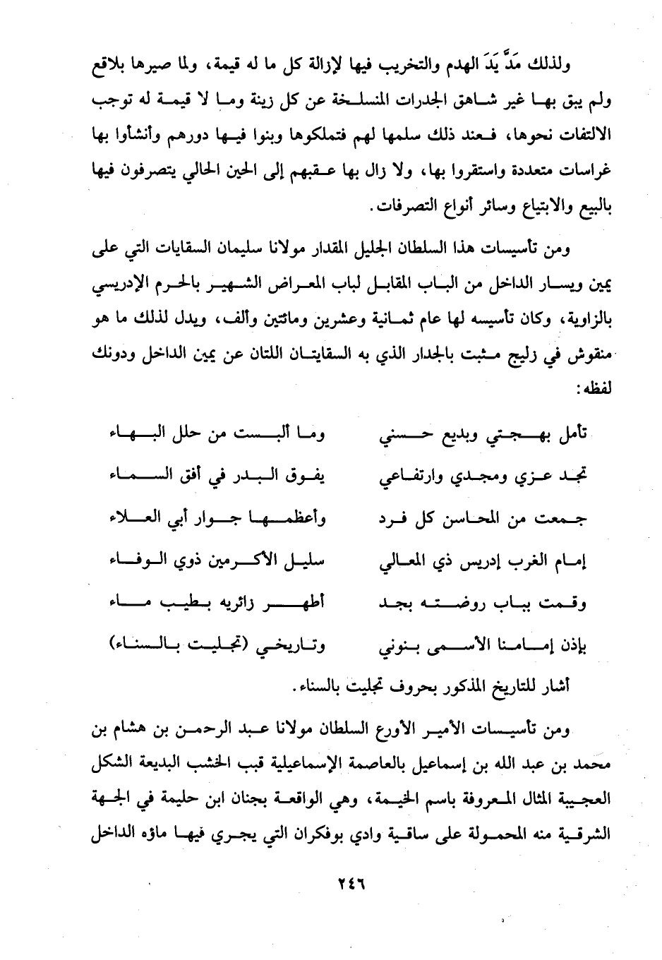 ولذلك مَدَّ يَدَ الهدم والتخريب فيها لإزالة كل ما له قيمة، ولما صيرها بلاقع ولم يبق بها غير شاهق الجدرات المنسلخة عن كل زينة وما لا قيمة له توجب الالتفات نحوها، فعند ذلك سلمها لهم فتملكوها وبنوا فيها دورهم وأنشأوا بها غراسات متعددة واستقروا بها، ولا زال بها عقبهم إلى الحين الحالي يتصرفون فيها بالبيع والابتياع وسائر أنواع التصرفات.