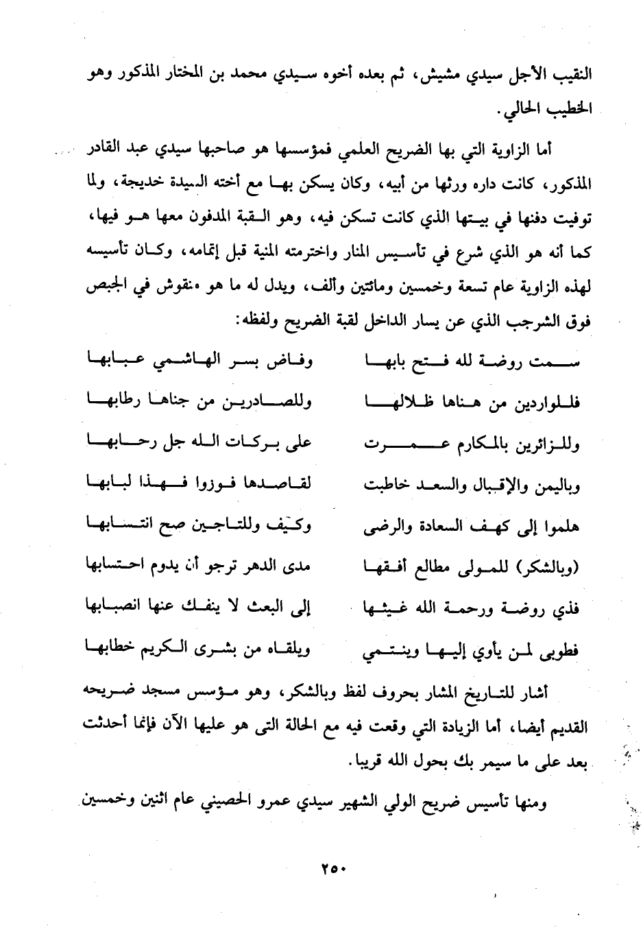 أشار للتاريخ المشار بحروف لفظ وبالشكر، وهو مؤسس مسجد ضريحه القديم أيضا، أما الزيادة التي وقعت فيه مع الحالة التي هو عليها الآن فإنما أحدثت - بعد على ما سيمر بك بحول الله قريبا.