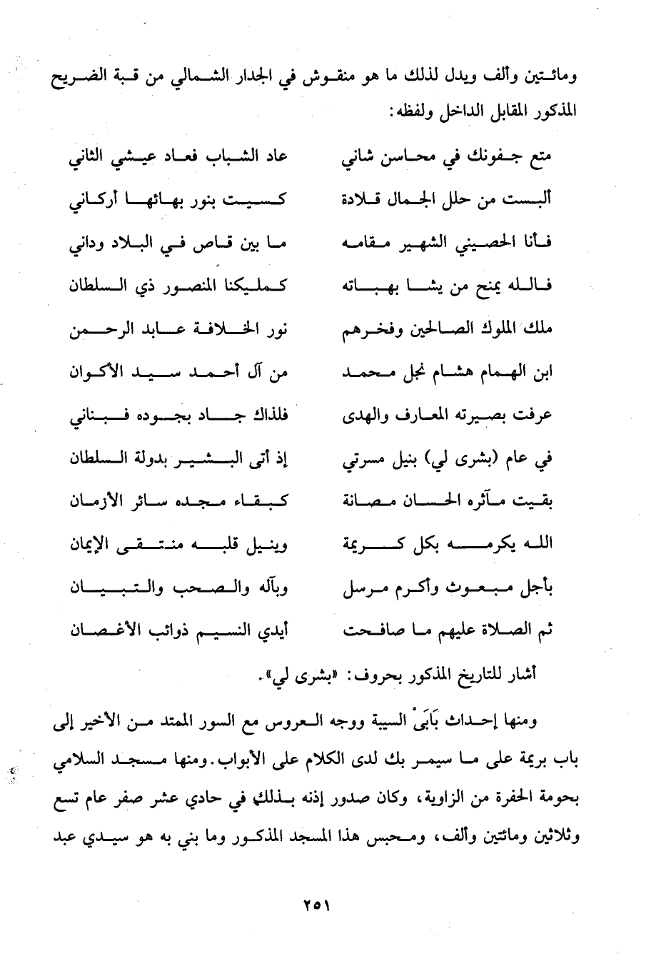 ومائتين وألف ويدل لذلك ما هو منقوش في الجدار الشمالي من قبة الضريح المذكور المقابل الداخل ولفظه: