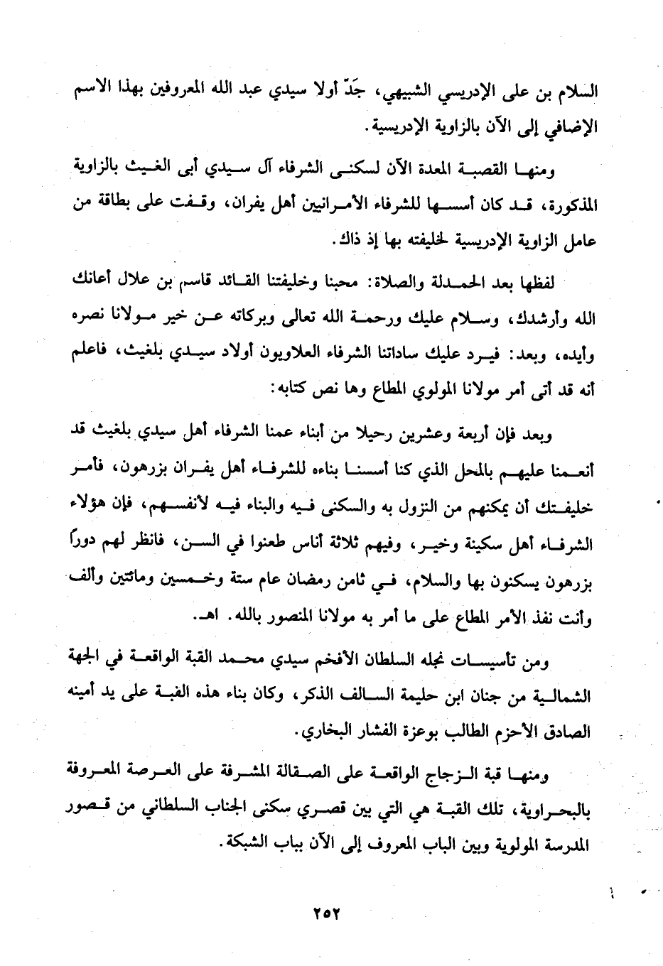 وبعد فإن أربعة وعشرين رحيلا من أبناء عمنا الشرفاء أهل سيدي بلغيث قد أنعمنا عليهم بالمحل الذي كنا أسسنا بناءه للشرفاء أهل يفران بزرهون، فأمر خليفتك أن يمكنهم من النزول به والسكنى فيه والبناء فيه لأنفسهم، فإن هؤلاء الشرفاء أهل سكينة وخير، وفيهم ثلاثة أناس طعنوا في السن، فانظر لهم دورًا بزرهون يسكنون بها والسلام، في ثامن رمضان عام ستة وخمسين ومائتين وألف. وأنت نفذ الأمر المطاع على ما أمر به مولانا المنصور بالله. اهـ.