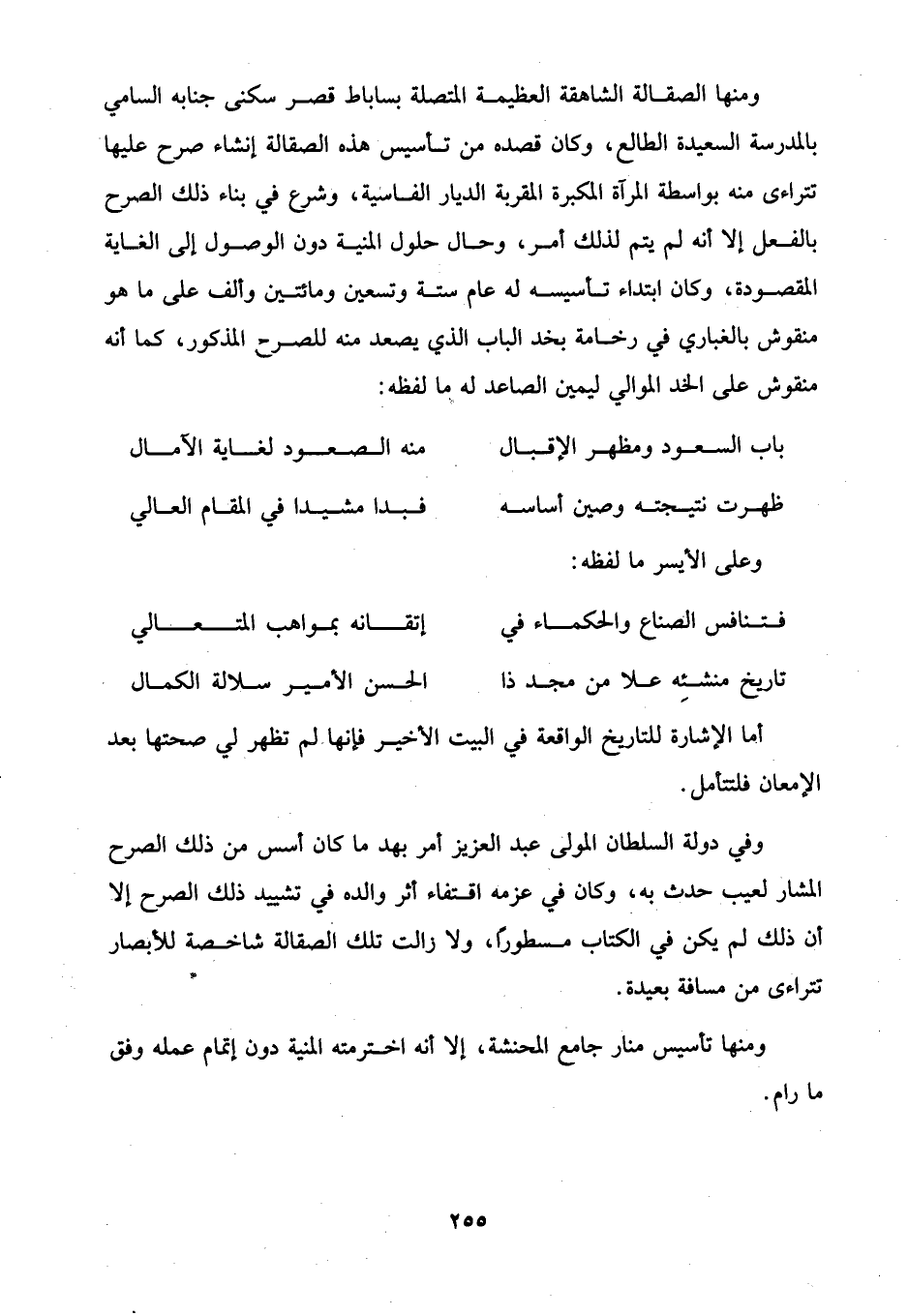ومنها الصقالة الشاهقة العظيمة المتصلة بساباط قصر سكنى جنابه السامي بالمدرسة السعيدة الطالع، وكان قصده من تأسيس هذه الصقالة إنشاء صرح عليها تتراءى منه بواسطة المرآة المكبرة المقربة الديار الفاسية، وشرع في بناء ذلك الصرح بالفعل إلا أنه لم يتم لذلك أمر، وحال حلول المنية دون الوصول إلى الغاية المقصودة، وكان ابتداء تأسيسه له عام ستة وتسعين ومائتين وألف على ما هو منقوش بالغباري في رخامة بخد الباب الذي يصعد منه للصرح المذكور، كما أنه منقوش على الخد الموالي ليمين الصاعد له ما لفظه: