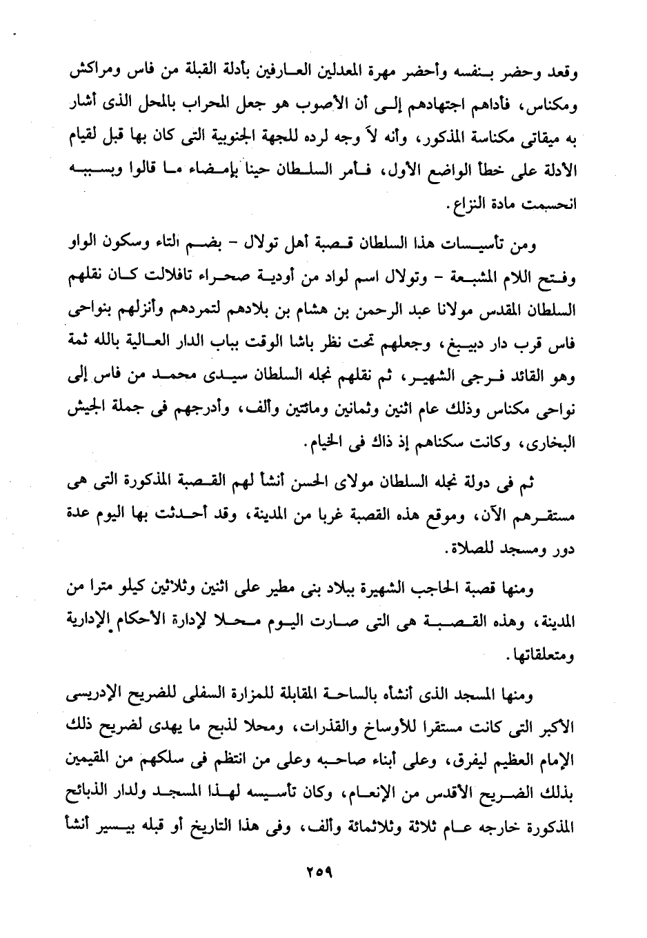 ومن تأسيسات هذا السلطان قصبة أهل تولال -بضم التاء وسكون الواو وفتح اللام المشبعة- وتولال اسم لواد من أودية صحراء تافلالت كان نقلهم السلطان المقدس مولانا عبد الرحمن بن هشام بن بلادهم لتمردهم وأنزلهم بنواحى فاس قرب دار دبيبغ، وجعلهم تحت نظر باشا الوقت بباب الدار العالية بالله ثمة وهو القائد فرجى الشهير، ثم نقلهم نجله السلطان سيدى محمد من فاس إلى نواحى مكناس وذلك عام اثنين وثمانين ومائتين وألف، وأدرجهم في جملة الجيش البخارى، وكانت سكناهم إذ ذاك في الخيام.