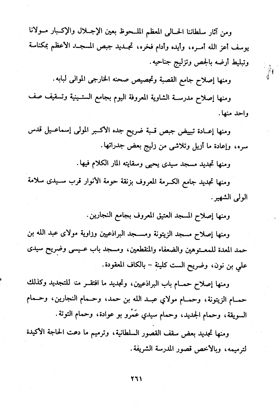 ومن آثار سلطاننا الحالى المعظم الملحوظ بعين الإجلال والإكبار مولانا يوسف أعز الله أمره، وأيده وأدام فخره، تجديد جبص المسجد الأعظم بمكناسة وتبليط أرضه بالجص وتزليج جناحيه.