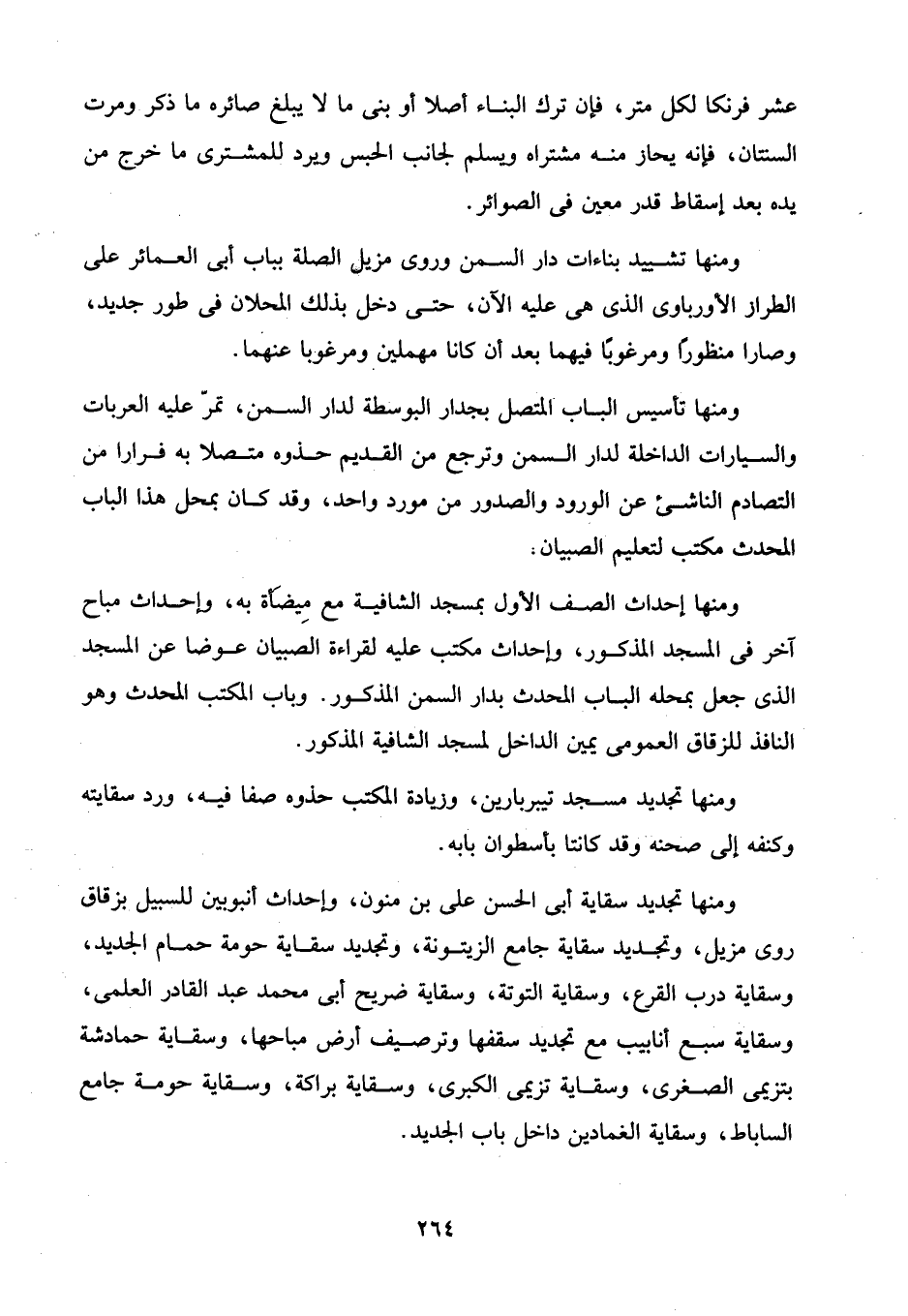 ومنها تشييد بناءات دار السمن وروى مزيل الصلة بباب أبى العمائر على الطراز الأورباوى الذى هى عليه الآن، حتى دخل بذلك المحلان في طور جديد، وصارا منظوراً ومرغوبًا فيهما بعد أن كانا مهملين ومرغوبا عنهما.