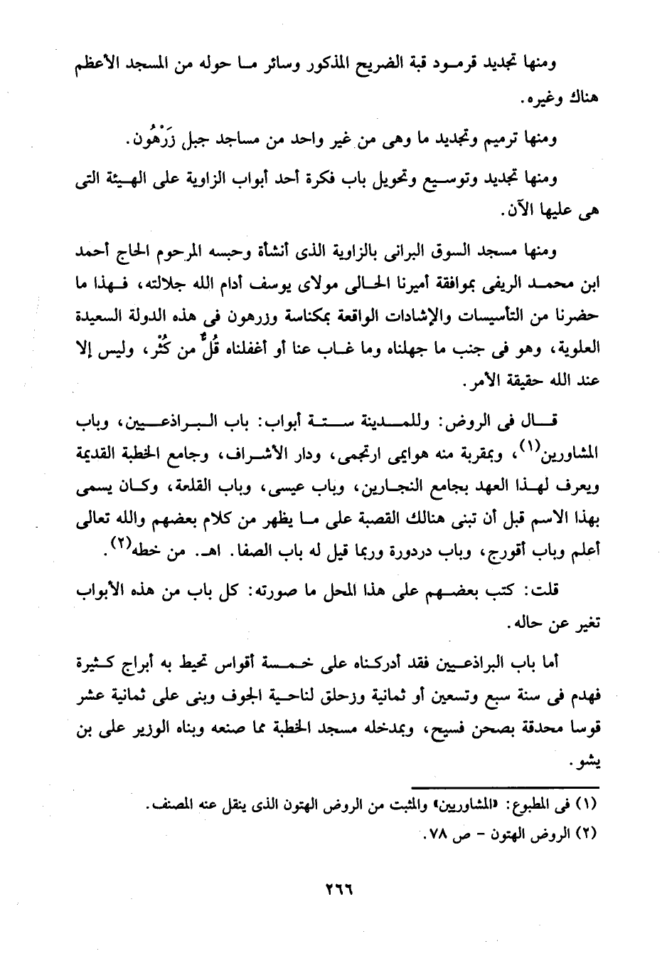 قال في الروض: وللمدينة ستة أبواب: باب البراذعيين، وباب المشاورين (¬1)، وبمقربة منه هوايمى ارتجمى، ودار الأشراف، وجامع الخطبة القديمة ويعرف لهذا العهد بجامع النجارين، وباب عيسى، وباب القلعة، وكان يسمى بهذا الاسم قبل أن تبنى هنالك القصبة على ما يظهر من كلام بعضهم والله تعالى أعلم وباب أقورج، وباب دردورة وربما قيل له باب الصفا. اهـ. من خطه (¬2).