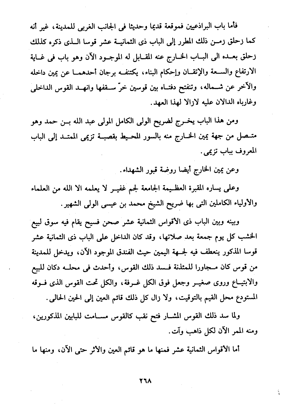وبينه وبين الباب ذى الأقواس الثمانية عشر صحن فسيح يقام فيه سوق لبيع الخشب كل يوم جمعة بعد صلاتها، وقد كان الداخل على الباب ذى الثمانية عشر قوسا المذكور ينعطف فيه لجهة اليمين حيث الفندق الموجود الآن، ويدخل للمدينة من قوس كان مجاورا للمئذنة فسد ذلك القوس، وأحدث في محله دكان للبيع والابتياع وروى صغير وجعل فوق الكل غرفة، والكل تحت القوس الذى فوقه المستودع محل القيم بالتوقيت، ولا زال كل ذلك قائم العين إلى الحين الحالى.