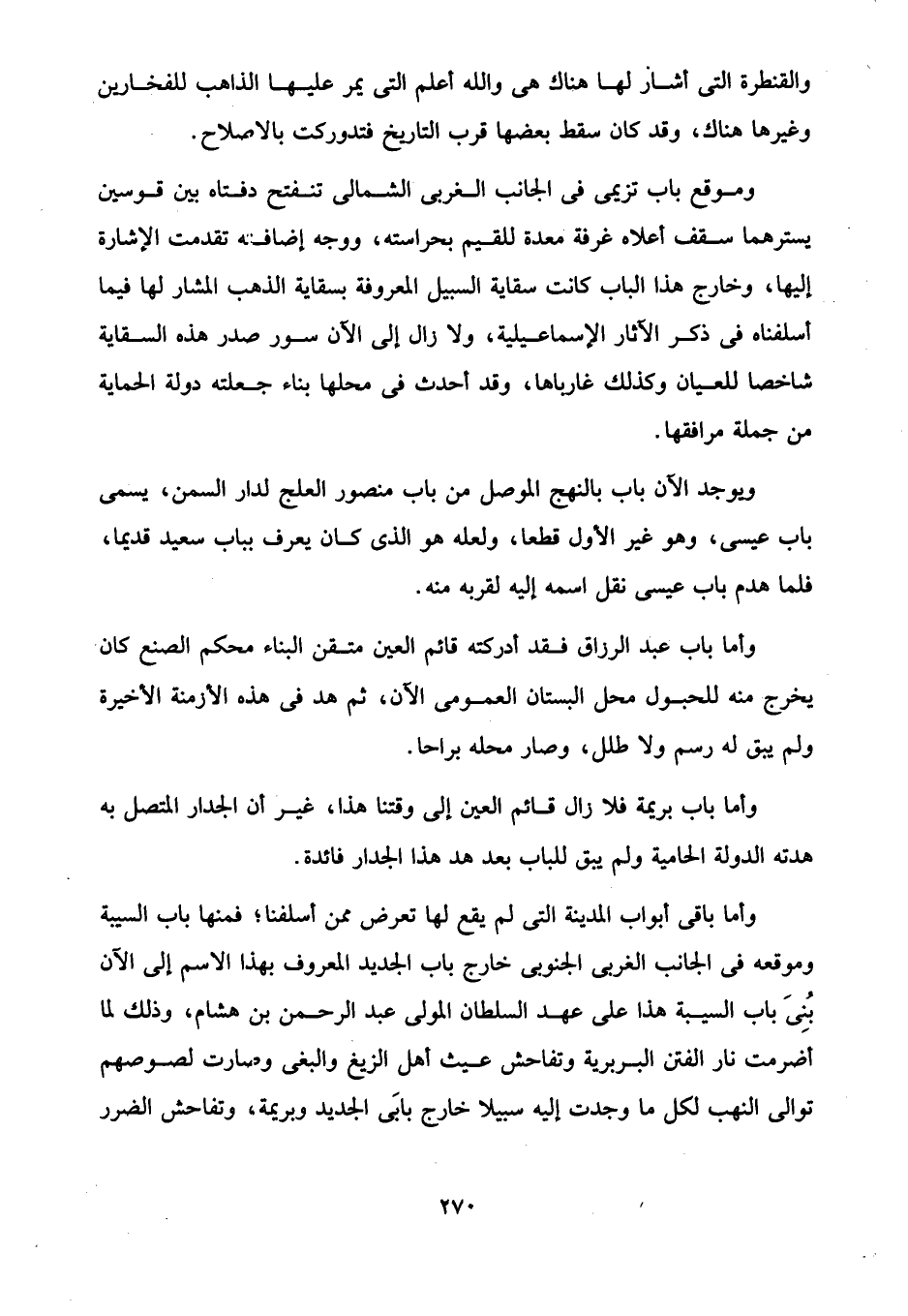 وأما باب عبد الرزاق فقد أدركته قائم العين متقن البناء محكم الصنع كان يخرج منه للحبول محل البستان العمومى الآن، ثم هد في هذه الأزمنة الأخيرة ولم يبق له رسم ولا طلل، وصار محله براحا.