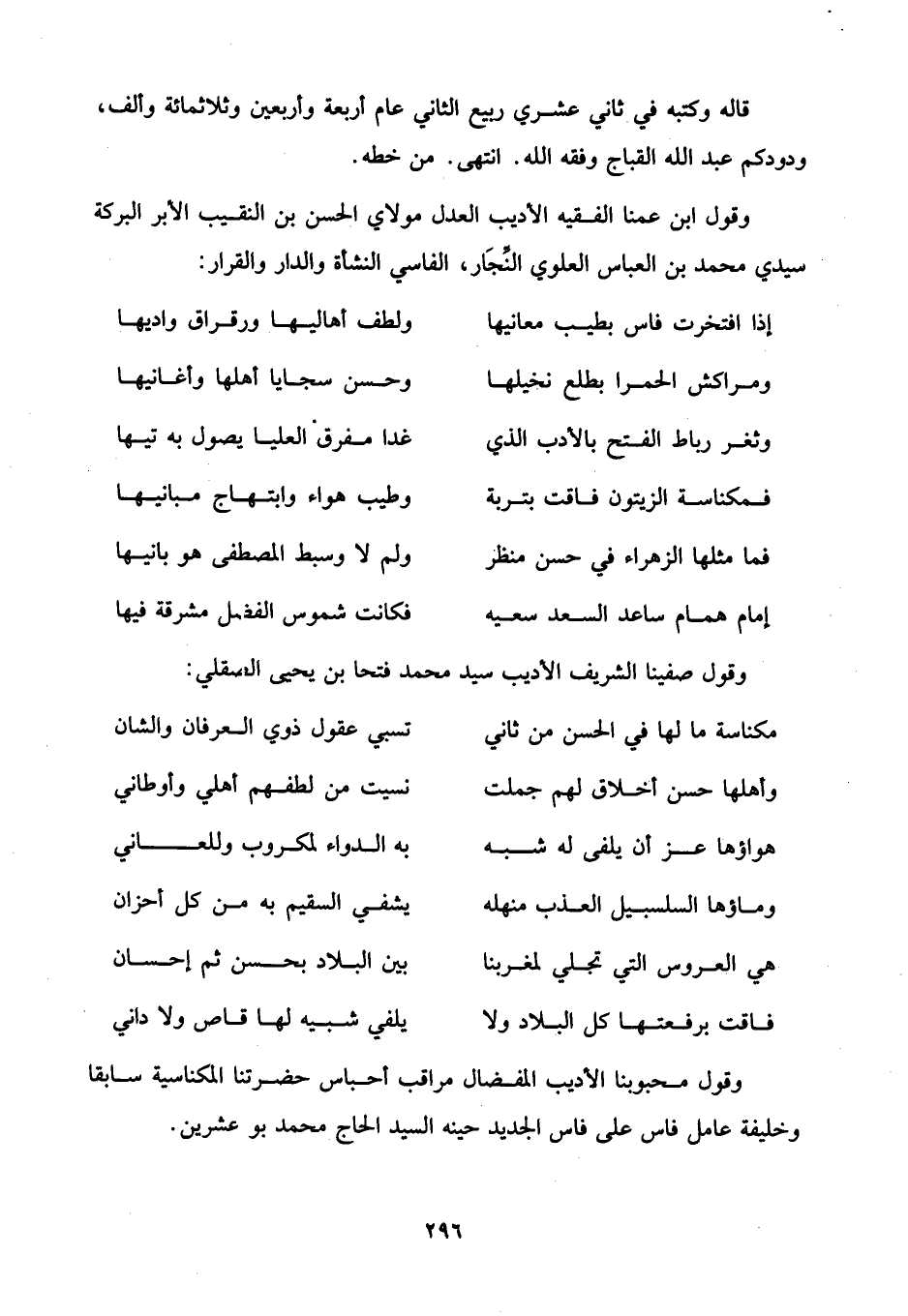 وقول محبوبنا الأديب المفضال مراقب أحباس حضرتنا المكناسية سابقا وخليفة عامل فاس على فاس الجديد حينه السيد الحاج محمد بو عشرين.