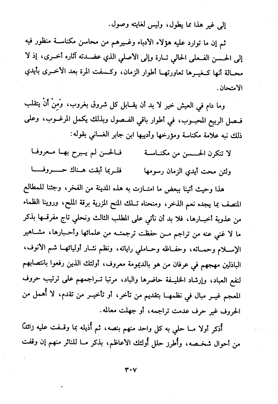وما دام في العيش خير لا بد أن يقابل كل شروق بغروب، وَمِنْ أنْ يتقلب فصل الربيع المحبوب، في أطوار باقي الفصول وبذلك يكمل المرغوب، وعلى ذلك نبه علامة مكناسة ومؤرخها وأديبها ابن جابر الغساني بقوله: