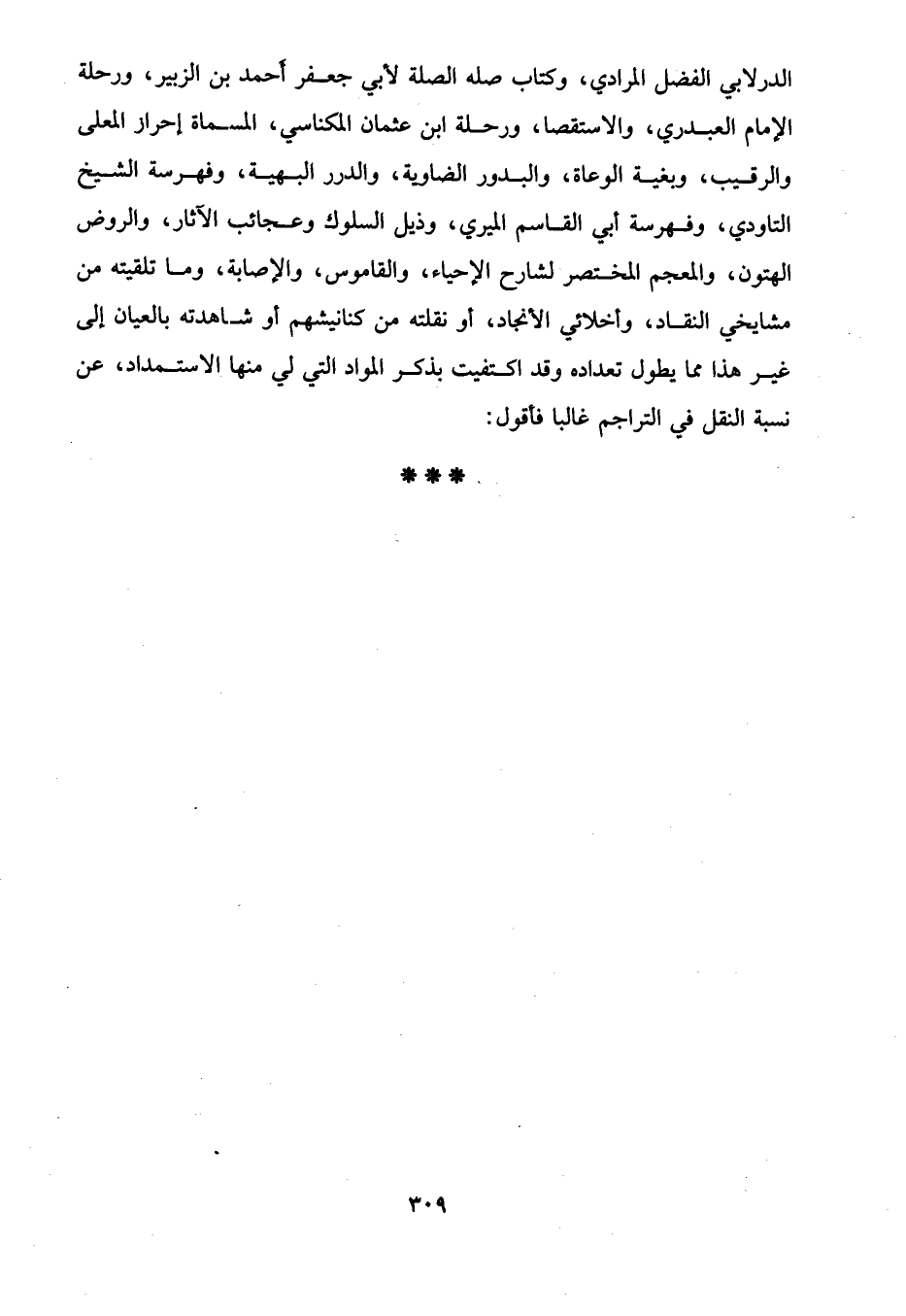 الدرلابي الفضل المرادي، وكتاب صله الصلة لأبي جعفر أحمد بن الزبير، ورحلة الإمام العبدري، والاستقصا، ورحلة ابن عثمان المكناسي، المسماة إحراز المعلى والرقيب، وبغية الوعاة، والبدور الضاوية، والدرر البهية، وفهرسة الشيخ التاودي، وفهرسة أبي القاسم الميري، وذيل السلوك وعجائب الآثار، والروض الهتون، والمعجم المختصر لشارح الإحياء، والقاموس، والإصابة، وما تلقيته من مشايخي النقاد، وأخلائي الأنجاد، أو نقلته من كنانيشهم أو شاهدته بالعيان إلى غير هذا مما يطول تعداده وقد اكتفيت بذكر المواد التي لي منها الاستمداد، عن نسبة النقل في التراجم غالبا فأقول: