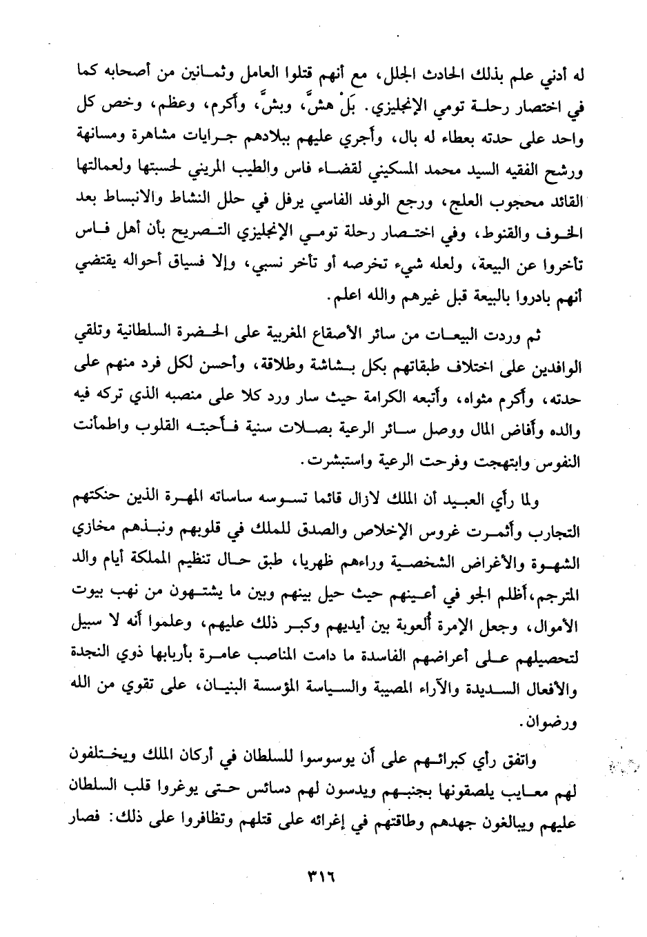 له أدني علم بذلك الحادث الجلل، مع أنهم قتلوا العامل وثمانين من أصحابه كما في اختصار رحلة تومي الإنجليزي. بَلْ هشَّ، وبشَّ، وأَكرم، وعظم، وخص كل واحد على حدته بعطاء له بال، وأجري عليهم ببلادهم جرايات مشاهرة ومسانهة ورشح الفقيه السيد محمد المسكيني لقضاء فاس والطيب المريني لحسبتها ولعمالتها القائد محجوب العلج، ورجع الوفد الفاسي يرفل في حلل النشاط والانبساط بعد الخوف والقنوط، وفي اختصار رحلة تومي الإنجليزي التصريح بأن أهل فاس تأخروا عن البيعة، ولعله شيء تخرصه أو تأخر نسبي، وإلا فسياق أحواله يقتضي أنهم بادروا بالبيعة قبل غيرهم والله اعلم.