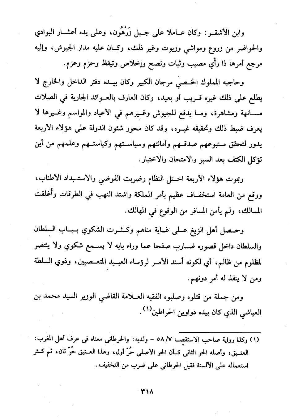 ومن جملة من قتلوه وصلبوه الفقيه العلامة القاضي الوزير السيد محمد بن العياشي الذي كان بيده دواوين الحراطين (¬1).