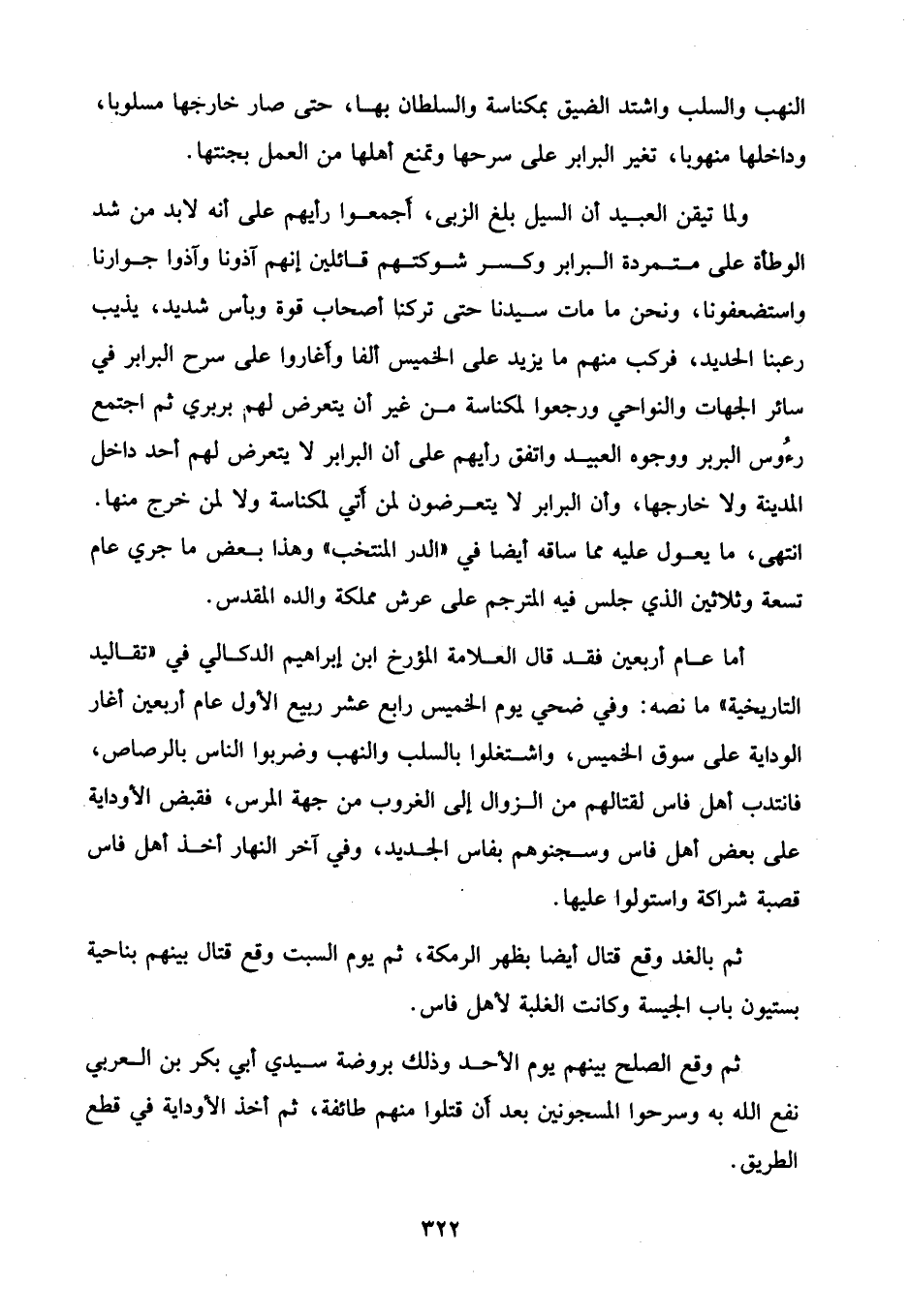 ولما تيقن العبيد أن السيل بلغ الزبى، أجمعوا رأيهم على أنه لابد من شد الوطأة على متمردة البرابر وكسر شوكتهم قائلين إنهم آذونا وآذوا جوارنا واستضعفونا، ونحن ما مات سيدنا حتى تركنا أصحاب قوة وبأس شديد، يذيب رعبنا الحديد، فركب منهم ما يزيد على الخميس ألفا وأغاروا على سرح البرابر في سائر الجهات والنواحي ورجعوا لمكناسة من غير أن يتعرض لهم بربري ثم اجتمع رءُوس البربر ووجوه العبيد واتفق رأيهم على أن البرابر لا يتعرض لهم أحد داخل المدينة ولا خارجها، وأن البرابر لا يتعرضون لمن أتي لمكناسة ولا لمن خرج منها. انتهى، ما يعول عليه مما ساقه أيضا في "الدر المنتخب" وهذا بعض ما جري عام تسعة وثلاثين الذي جلس فيه المترجم على عرش مملكة والده المقدس.