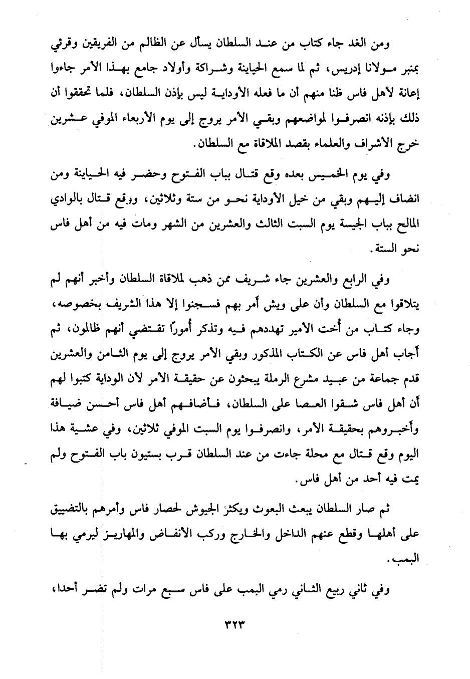وفي الرابع والعشرين جاء شريف ممن ذهب لملاقاة السلطان وأخبر أنهم لم يتلاقوا مع السلطان وأن على ويش أمر بهم فسجنوا إلا هذا الشريف بخصوصه، وجاء كتاب من أخت الأمير تهددهم فيه وتذكر أُمورًا تقتضي أنهم ظالمون، ثم أجاب أهل فاس عن الكتاب المذكور وبقي الأمر يروج إلى يوم الثامن والعشرين قدم جماعة من عبيد مشرع الرملة يبحثون عن حقيقة الأمر لأن الوداية كتبوا لهم أن أهل فاس شقوا العصا على السلطان، فأضافهم أهل فاس أحسن ضيافة وأخبروهم بحقيقة الأمر، وانصرفوا يوم السبت الموفي ثلاثين، وفي عشية هذا اليوم وقع قتال مع محلة جاءت من عند السلطان قرب بستيون باب الفتوح ولم يمت فيه أحد من أهل فاس.