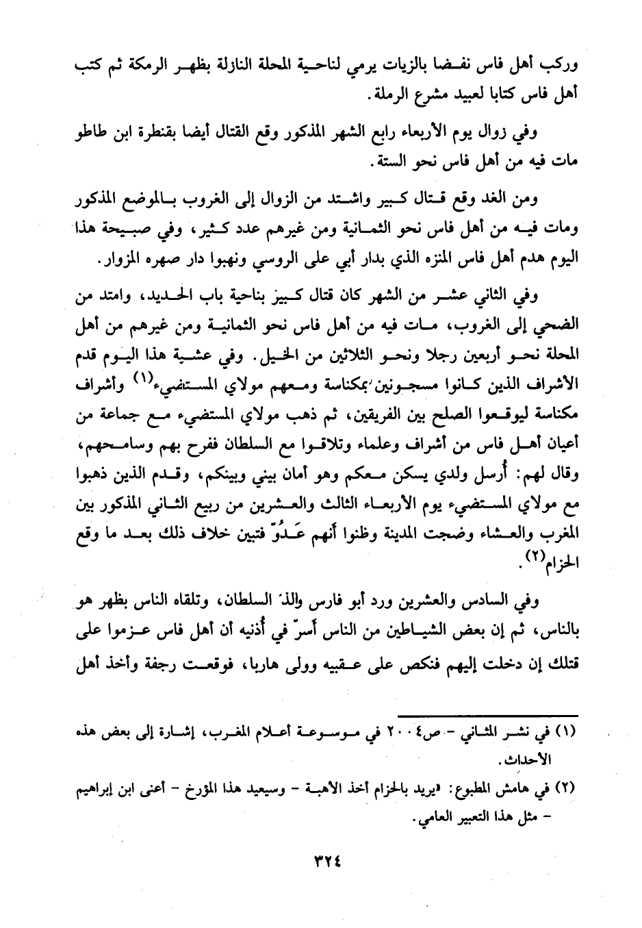 ومن الغد وقع قتال كبير واشتد من الزوال إلى الغروب بالموضع المذكور ومات فيه من أهل فاس نحو الثمانية ومن غيرهم عدد كثير، وفي صبيحة هذا اليوم هدم أهل فاس المنزه الذي بدار أبي على الروسي ونهبوا دار صهره المزوار.