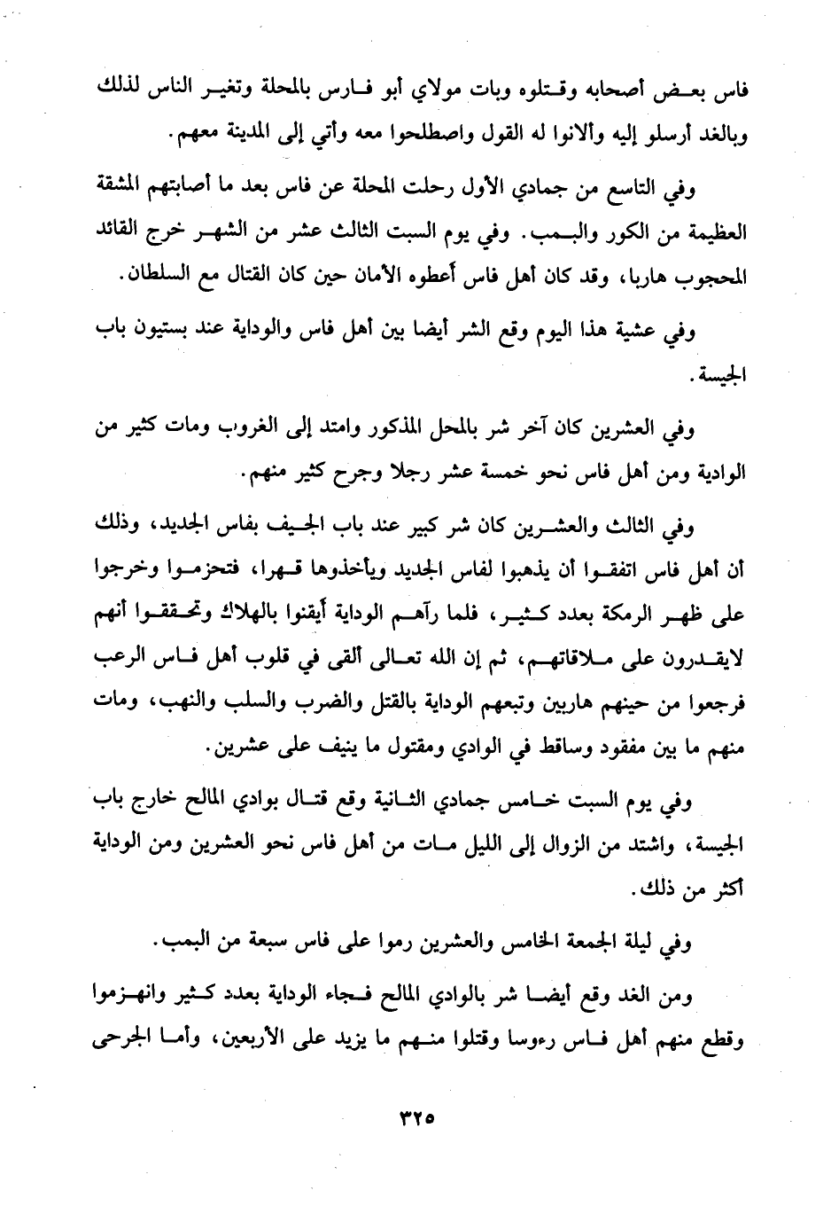 وفي العشرين كان آخر شر بالمحل المذكور وامتد إلى الغروب ومات كثير من الوادية ومن أهل فاس نحو خمسة عشر رجلا وجرح كثير منهم.