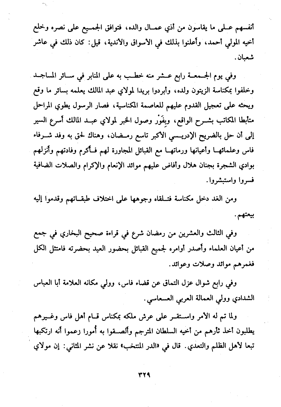 ولما تم له الأمر واستقر على عرش ملكه بمكناس قام أهل فاس وغيرهم يطلبون أخذ ثأرهم من أخيه السلطان المترجم وألصقوا به أمورا زعموا أنه ارتكبها تبعا لأهل الظلم والتعدي. قال في "الدر المنتخب" نقلا عن نشر المثاني: إن مولاي