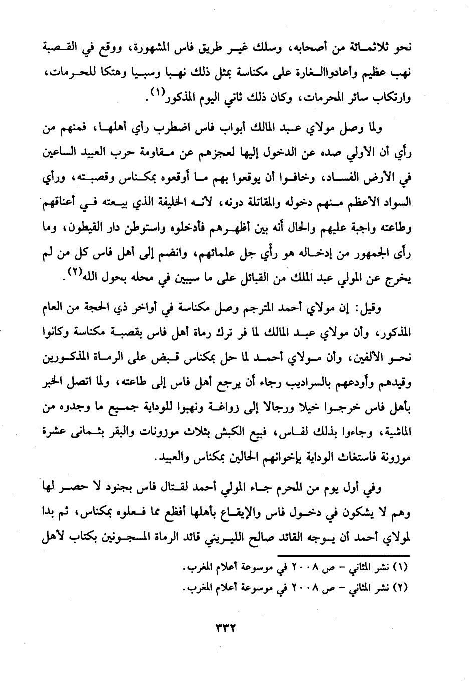 نحو ثلاثمائة من أصحابه، وسلك غير طريق فاس المشهورة، ووقع في القصبة نهب عظيم وأعادوا الغارة على مكناسة بمثل ذلك نهبا وسبيا وهتكا للحرمات، وارتكاب سائر المحرمات، وكان ذلك ثاني اليوم المذكور (¬1).