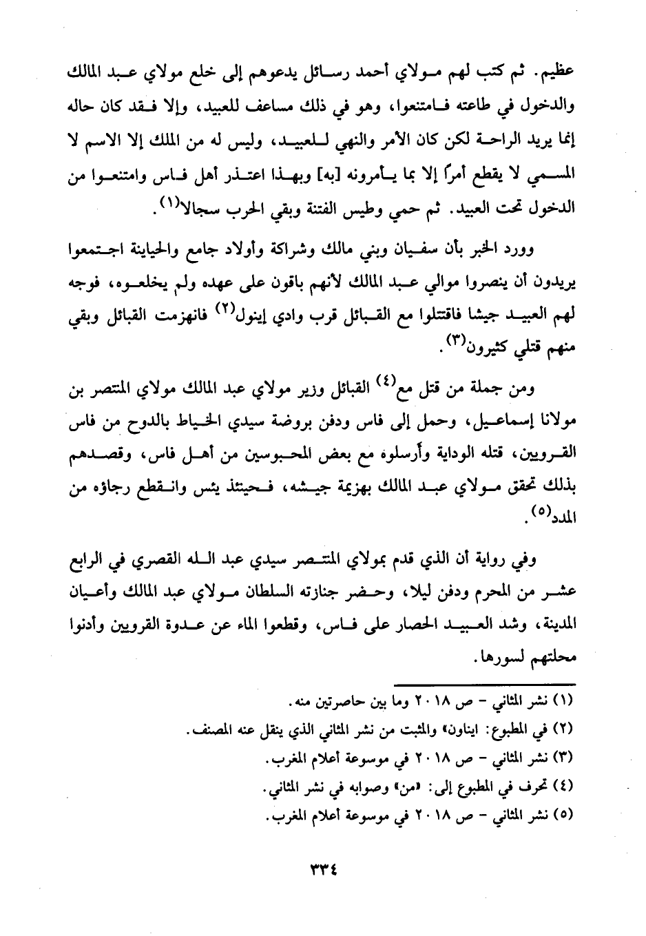 عظيم. ثم كتب لهم مولاي أحمد رسائل يدعوهم إلى خلع مولاي عبد المالك والدخول في طاعته فامتنعوا، وهو في ذلك مساعف للعبيد، وإلا فقد كان حاله إنما يريد الراحة لكن كان الأمر والنهي للعبيد، وليس له من الملك إلا الاسم لا المسمي لا يقطع أمرًا إلا بما يأمرونه [به] وبهذا اعتذر أهل فاس وامتنعوا من الدخول تحت العبيد. ثم حمي وطيس الفتنة وبقي الحرب سجالا (¬1).