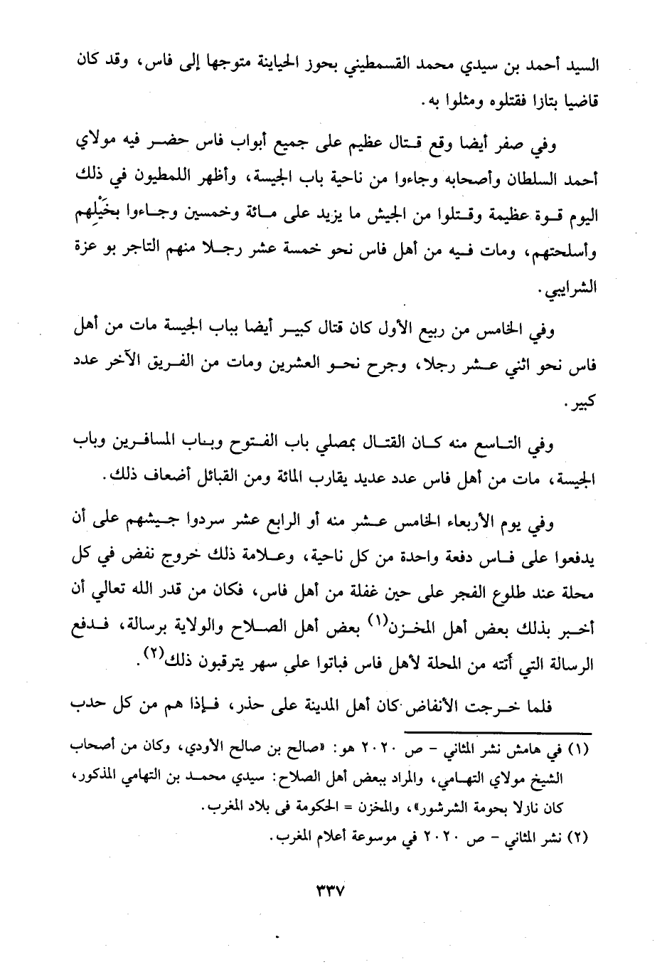 (¬1) في هامش نشر المثاني - ص 2020 هو: "صالح بن صالح الأودي، وكان من أصحاب الشيخ مولاي التهامي، والمراد ببعض أهل الصلاح: سيدي محمد بن التهامي المذكور، كان نازلا بحومة الشرشور"، والمخزن = الحكومة في بلاد المغرب.