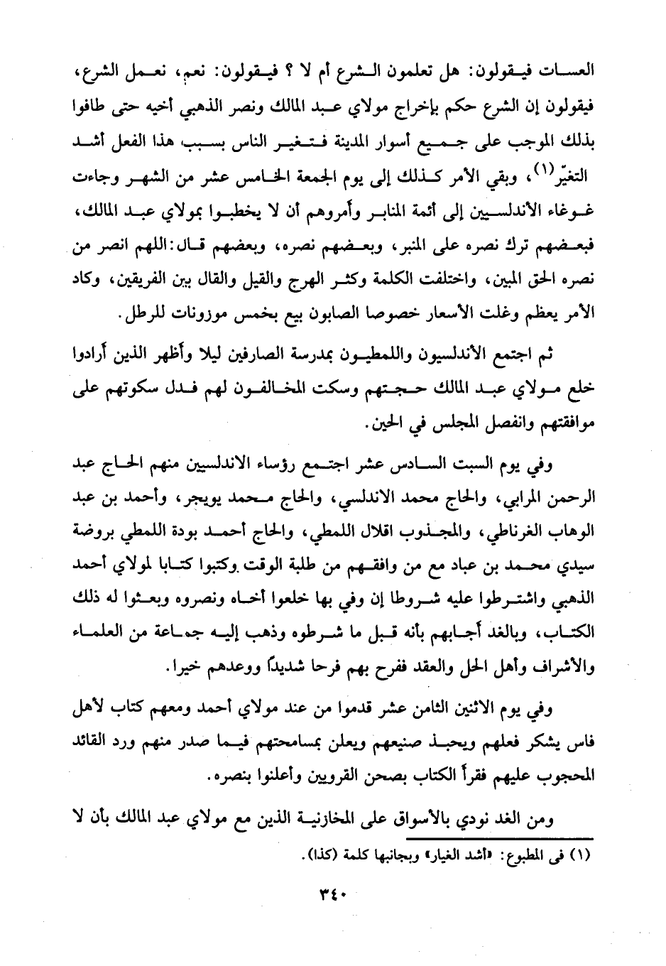 العسات فيقولون: هل تعلمون الشرع أم لا؟ فيقولون: نعم، نعمل الشرع، فيقولون إن الشرع حكم بإخراج مولاي عبد المالك ونصر الذهبي أخيه حتى طافوا بذلك الموجب على جميع أسوار المدينة فتغير الناس بسبب هذا الفعل أشد التغيّر (¬1)، وبقي الأمر كذلك إلى يوم الجمعة الخامس عشر من الشهر وجاءت غوغاء الأندلسيين إلى أئمة المنابر وأمروهم أن لا يخطبوا بمولاي عبد المالك، فبعضهم ترك نصره على المنبر، وبعضهم نصره، وبعضهم قال: اللهم انصر من نصره الحق المبين، واختلفت الكلمة وكثر الهرج والقيل والقال بين الفريقين، وكاد الأمر يعظم وغلت الأسعار خصوصا الصابون بيع بخمس موزونات للرطل.