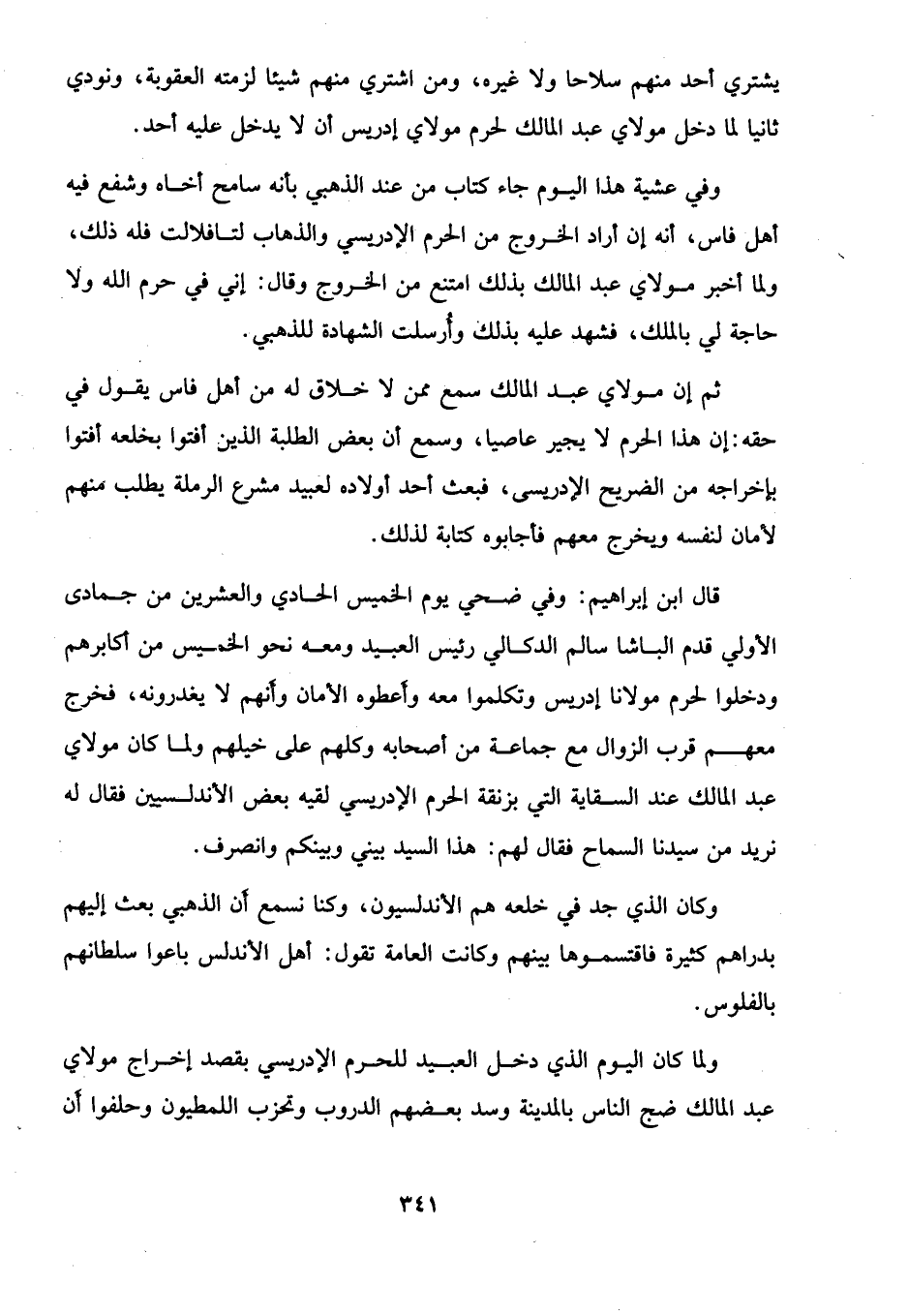 قال ابن إبراهيم: وفي ضحي يوم الخميس الحادي والعشرين من جمادى الأولى قدم الباشا سالم الدكالي رئيس العييد ومعه نحو الخميس من أكابرهم ودخلوا لحرم مولانا إدريس وتكلموا معه وأعطوه الأمان وأنهم لا يغدرونه، فخرج معهم قرب الزوال مع جماعة من أصحابه وكلهم على خيلهم ولما كان مولاي عبد المالك عند السقاية التي بزنقة الحرم الإدريسي لقيه بعض الأندلسيين فقال له نريد من سيدنا السماح فقال لهم: هذا السيد بيني وبينكم وانصرف.