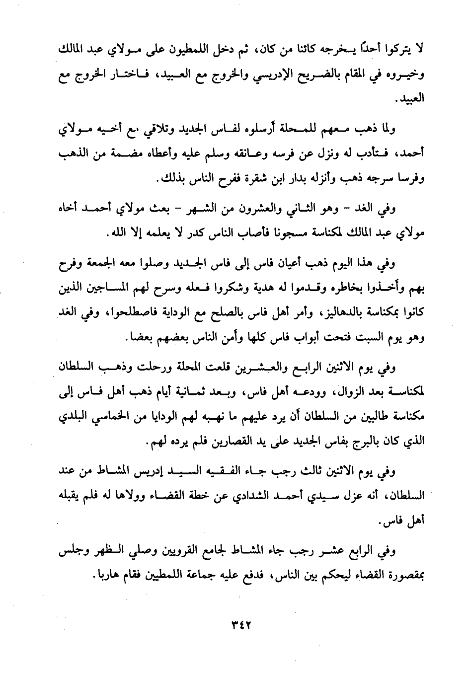 وفي الغد -وهو الثاني والعشرون من الشهر- بعث مولاي أحمد أخاه مولاي عبد المالك لمكناسة مسجونا فأصاب الناس كدر لا يعلمه إلا الله.