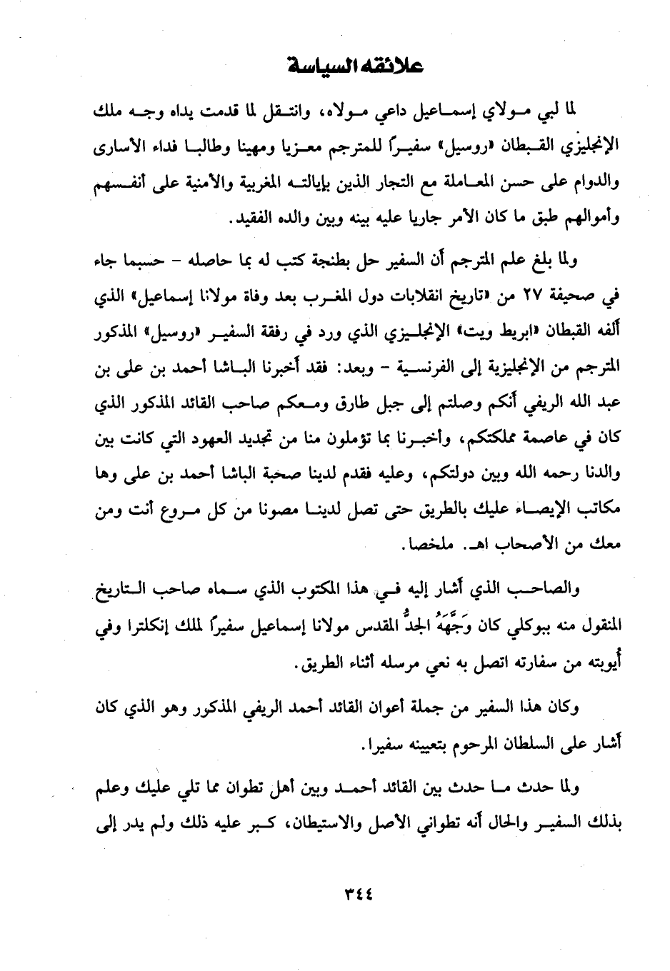 ولما بلغ علم المترجم أن السفير حل بطنجة كتب له بما حاصله -حسبما جاء في صحيفة 27 من "تاريخ انقلابات دول المغرب بعد وفاة مولانا إسماعيل" الذي ألفه القبطان "ابريط ويت" الإنجليزي الذي ورد في رفقة السفير "روسيل" المذكور المترجم من الإنجليزية إلى الفرنسية- وبعد: نقد أَخبرنا الباشا احمد بن على بن عبد الله الريفي أنكم وصلتم إلى جبل طارق ومعكم صاحب القائد المذكور الذي كان في عاصمة مملكتكم، وأخبرنا بما تؤملون منا من تجديد العهود التي كانت بين والدنا رحمه الله وبين دولتكم، وعليه فقدم لدينا صحبة الباشا أحمد بن على وها مكاتب الإيصاء عليك بالطريق حتى تصل لدينا مصونا من كل مروع أنت ومن معك من الأصحاب اهـ. ملخصا.