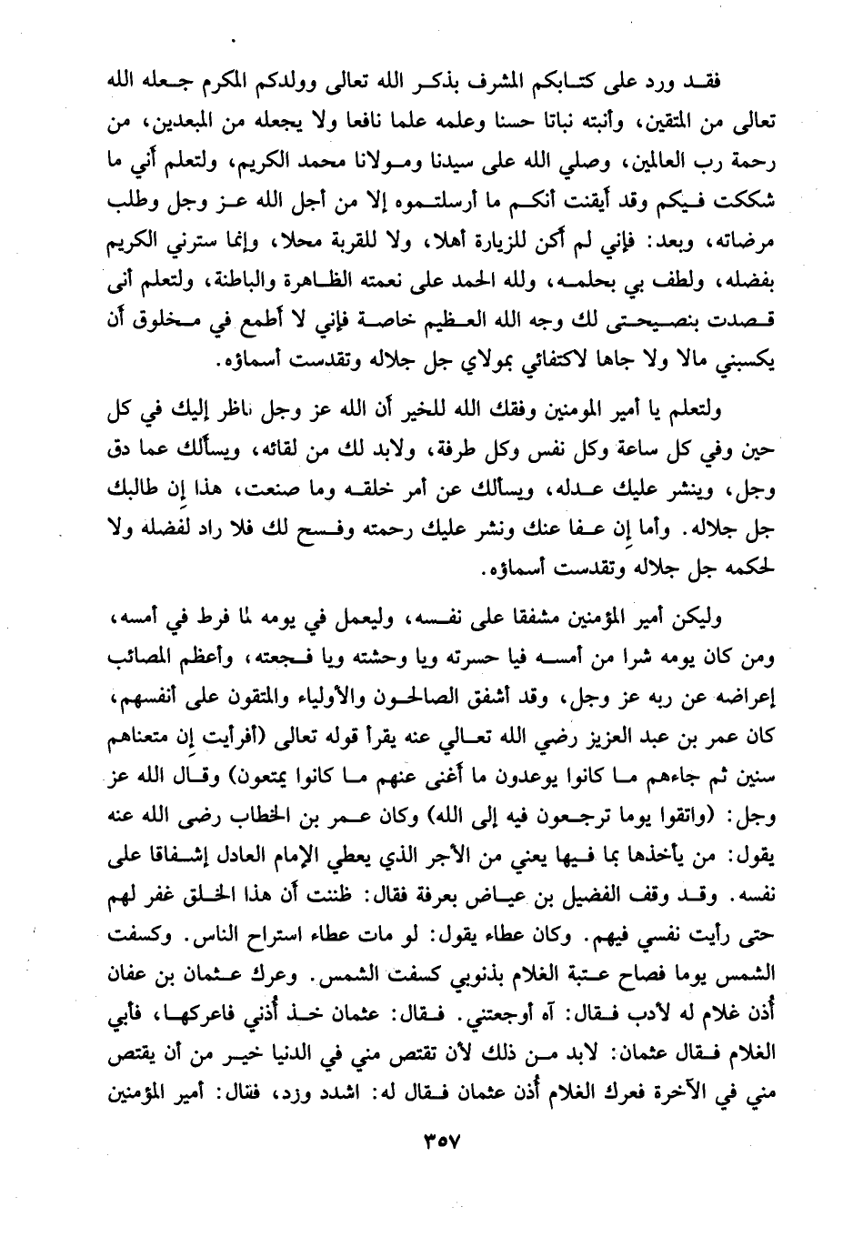 ولتعلم يا أمير المؤمنين وفقك الله للخير أن الله عَزَّ وَجَلَّ ناظر إليك في كل حين وفي كل ساعة وكل نفس وكل طرفة، ولابد لك من لقائه، ويسألك عما دق وجل، وينشر عليك عدله، ويسألك عن أمر خلقه وما صنعت، هذا إِن طالبك جل جلاله. وأما إِن عفا عنك ونشر عليك رحمته وفسح لك فلا راد لفضله ولا لحكمه جل جلاله وتقدست أسماؤه.