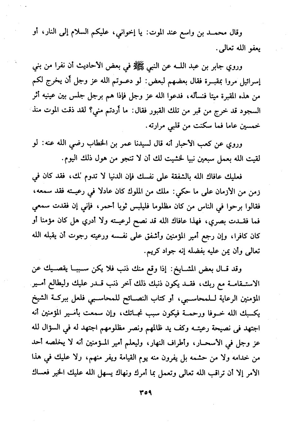 وروي جابر بن عبد الله عن النبي - صلى الله عليه وسلم - في بعض الأحاديث أن نفرا من بني إسرائيل مروا بمقبرة فقال بعضهم لبعض: لو دعوتم الله عَزَّ وَجَلَّ أن يخرج لكم من هذه المقبرة ميتا فنسأله، فدعوا الله عَزَّ وَجَلَّ فإذا هم برجل جلس بين عينيه أثر السجود قد خرج من قبر من تلك القبور فقال: ما أردتم مني؟ لقد ذقت الموت منذ خمسين عاما فما سكنت من قلبي مرارته.
