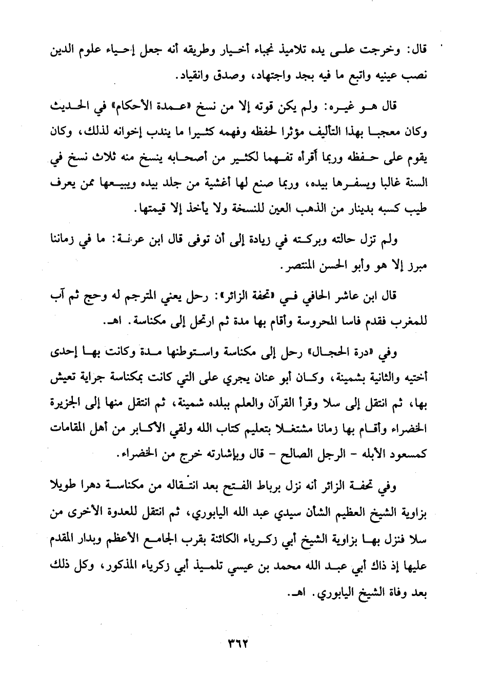 قال: وخرجت على يده تلاميذ نجباء أخيار وطريقه أنه جعل إحياء علوم الدين نصب عينيه واتبع ما فيه بجد واجتهاد، وصدق وانقياد.