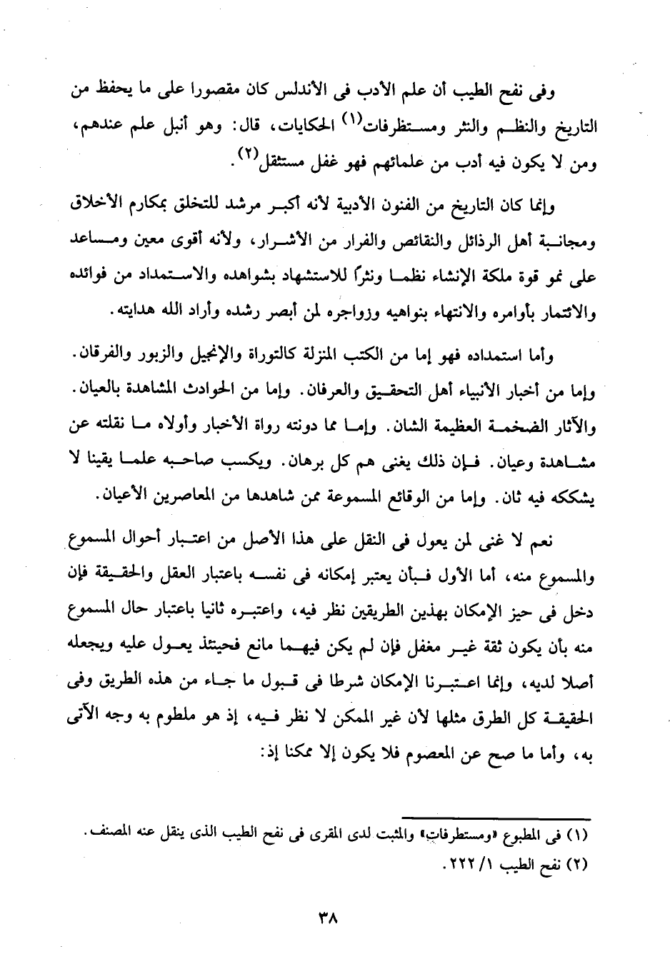 وفى نفح الطيب أن علم الأدب في الأندلس كان مقصورا على ما يحفظ من التاريخ والنظم والنثر ومستظرفات (¬1) الحكايات، قال: وهو أنبل علم عندهم، ومن لا يكون فيه أدب من علمائهم فهو غفل مستثقل (¬2).