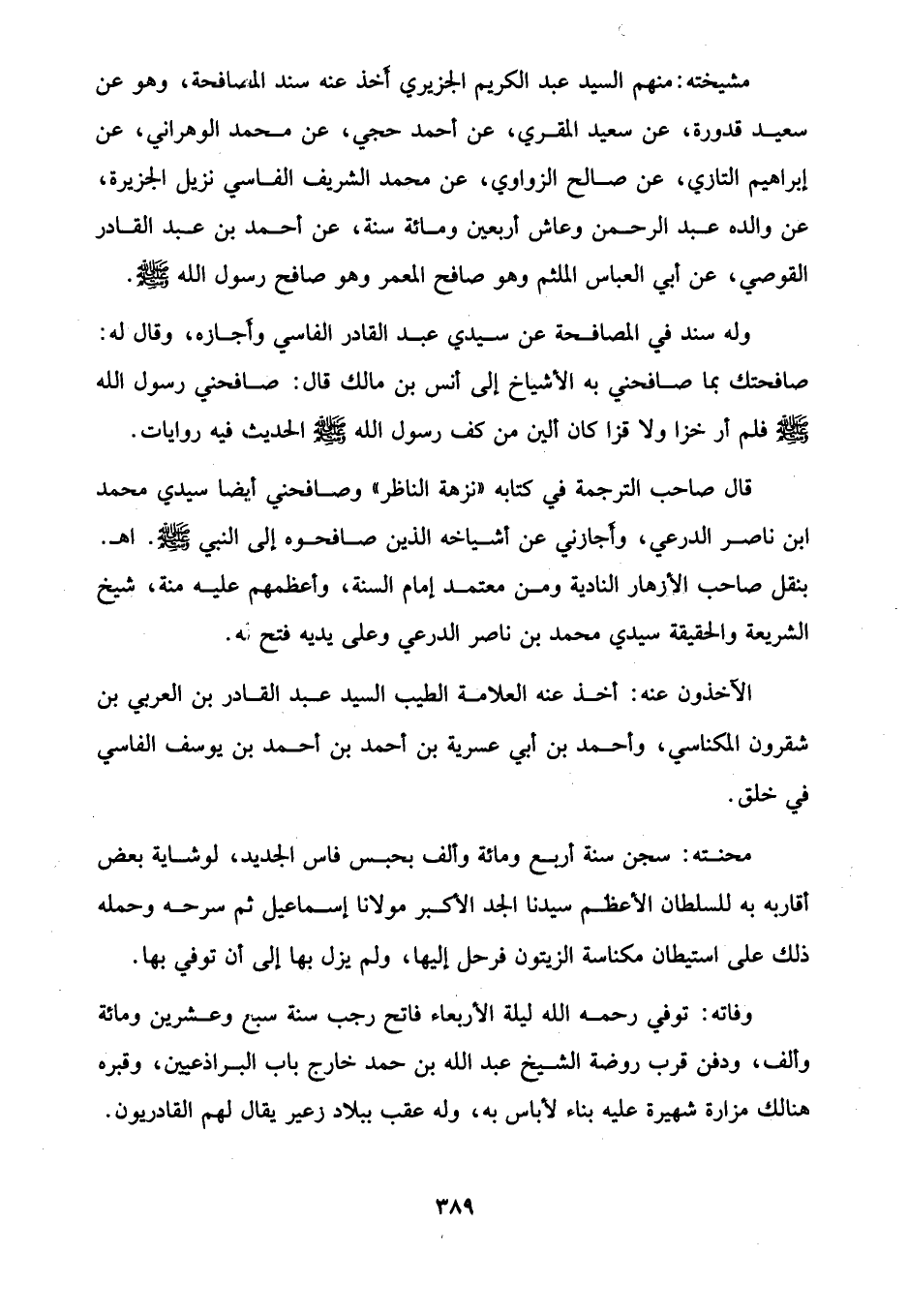 وله سند في المصافحة عن سيدي عبد القادر الفاسي وأجاره، وقال له: صافحتك بما صافحني به الأشياخ إلى أنس بن مالك قال: صافحني رسول الله - صلى الله عليه وسلم - فلم أر خزا ولا قزا كان ألين من كف رسول الله - صلى الله عليه وسلم - الحديث، فيه روايات.