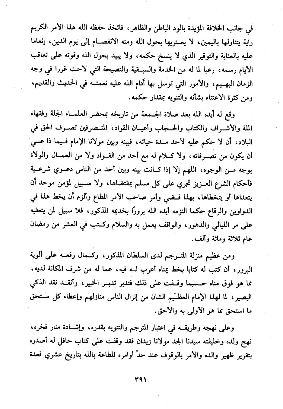 في جانب الخلافة المؤيدة بالود الباطن والظاهر، فاتخذ حفظه الله هذا الأمر الكريم راية يتناولها باليمين، لا يعتريها بحول الله ومنه الانفصام إلى يوم الدين، إنعاما عليه بالعناية والتوقير الذي لا ينسخ حكمه، ولا يبيد بحول الله وقوته على تعاقب الأيام رسمه، رعيا لما له من الخدمة والسبقية والنصيحة التي لاحت غررا في وجه الزمان البهيم، والأمور التي توسل بها أدام الله عليه نعمته في الحديث والقديم، ومن كثرة الاعتناء بشأنه والتنويه بمقدار حكمه.