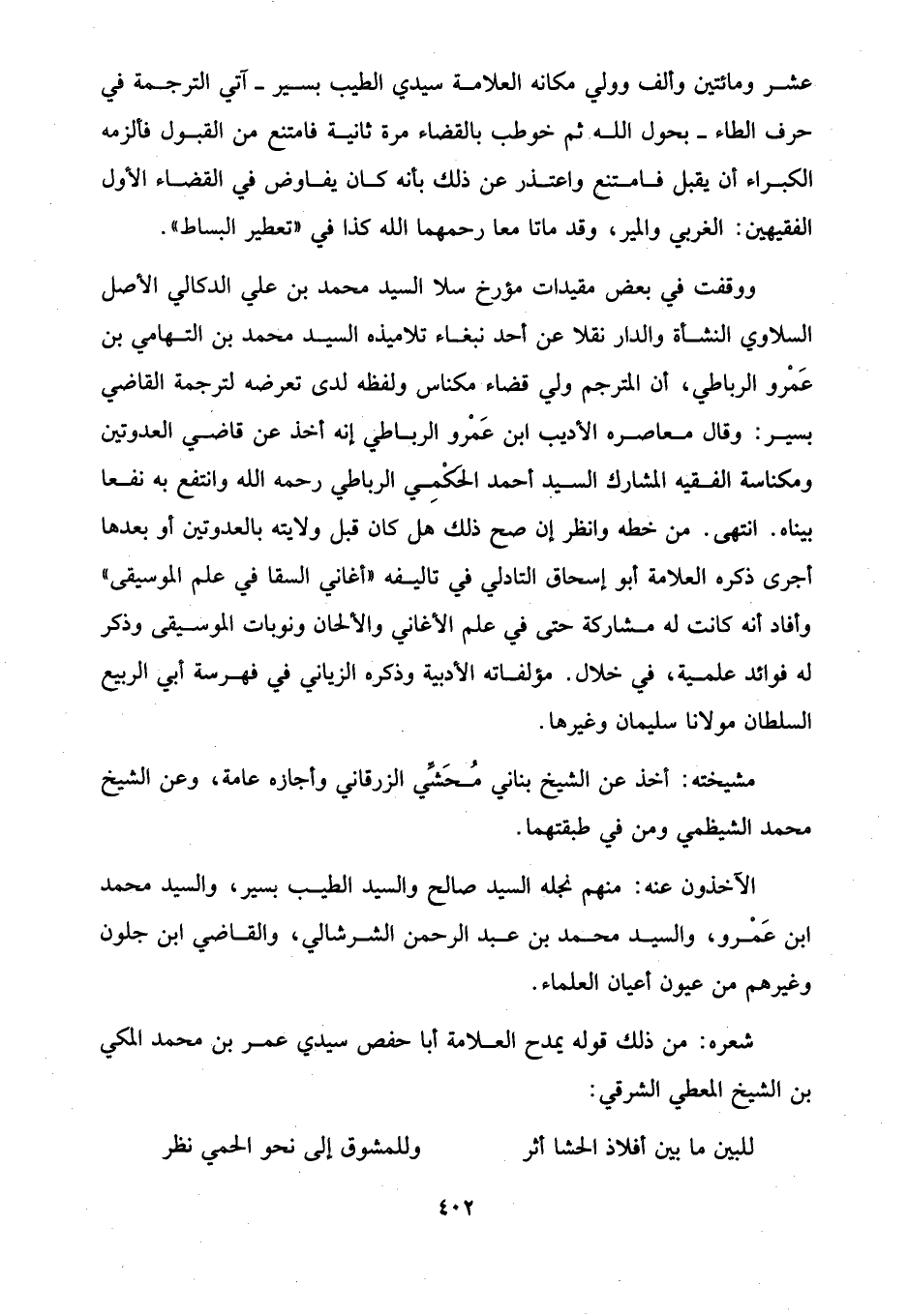 عشر ومائتين وألف وولي مكانه العلامة سيدي الطيب بسير -آتي الترجمة في حرف الطاء- بحول الله ثم خوطب بالقضاء مرة ثانية فامتنع من القبول فألزمه الكبراء أن يقبل فامتنع واعتذر عن ذلك بأنه كان يفاوض في القضاء الأول الفقيهين: الغربي والمير، وقد ماتا معا رحمهما الله كذا في "تعطير البساط".