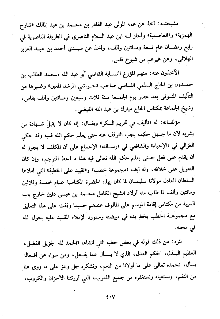 مؤلفاته: له "تأليف في تحريم السكر" ويقال: إنه كان لا يقبل شهادة من يشربه لأن ما جهل حكمه يجب التوقف عنه حتى يعلم حكم الله فيه وقد حكي الغزالي في "الإحياء" والشافعي في "رسالته" الإجماع على أن المكلف لا يجوز له أن يقدم على فعل حتى يعلم حكم الله تعالى فيه هذا ملحظ المترجم، وإن كان التعويل على خلافه، وله أيضًا "مجموعة خطب" و "تقييد على الخطبة" التي أملاها السلطان العادل مولانا سليمان لما كان بهذه الحضرة المكناسية عام خمسة وثلاثين ومائتين وألف لما طلب منه أولاد الشيخ الكامل محمَّد بن عيسى دفين خارج باب السيبة من مكناس إقامة الموسم على المألوف عندهم حسبما وقفت، على هذا التعليق مع مجموعة الخطب بخط يده في مبيضته وسنورد الإملاء المقيد عليه بحول الله في محله.