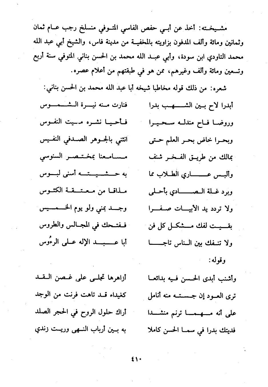 شعره: من ذلك قوله مخاطبا شيخه أبا عبد الله محمَّد بن الحسن بناني: