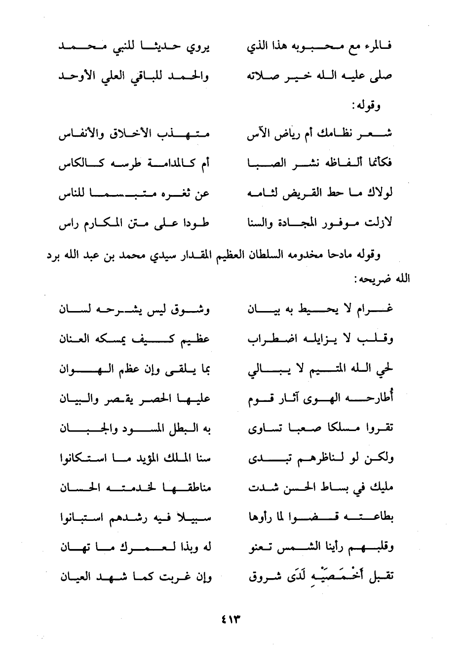 وقوله مادحا مخدومه السلطان العظيم المقدار سيدي محمَّد بن عبد الله برد الله ضريحه: