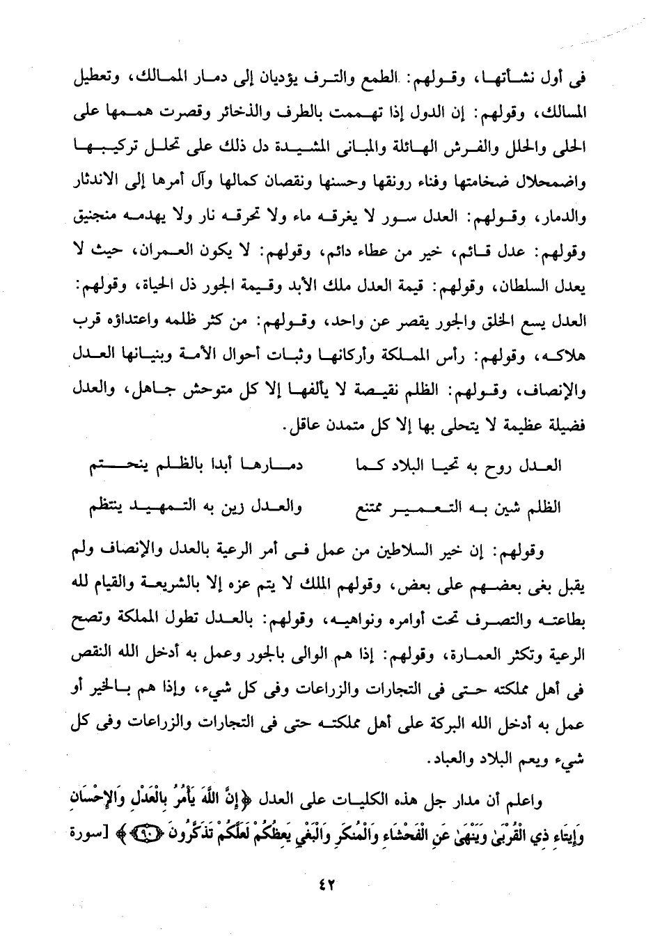 في أول نشأتها، وقولهم: الطمع والترف يؤديان إلى دمار الممالك، وتعطيل المسالك، وقولهم: إن الدول إذا تهممت بالطرف والذخائر وقصرت هممها على الحلى والحلل والفرش الهائلة والمبانى المشيدة دل ذلك على تحلل تركيبها واضمحلال ضخامتها وفناء رونقها وحسنها ونقصان كمالها وآل أمرها إلى الاندثار والدمار، وقولهم: العدل سور لا يغرقه ماء ولا تحرقه نار ولا يهدمه منجنيق وقولهم: عدل قائم، خير من عطاء دائم، وقولهم: لا يكون العمران، حيث لا يعدل السلطان، وقولهم: قيمة العدل ملك الأبد وقيمة الجور ذل الحياة، وقولهم: العدل يسع الخلق والجور يقصر عن واحد، وقولهم: من كثر ظلمه واعتداؤه قرب هلاكه، وقولهم: رأس المملكة وأركانها وثبات أحوال الأمة وبنيانها العدل والإنصاف، وقولهم: الظلم نقيصة لا يألفها إلا كل متوحش جاهل، والعدل فضيلة عظيمة لا يتحلى بها إلا كل متمدن عاقل.