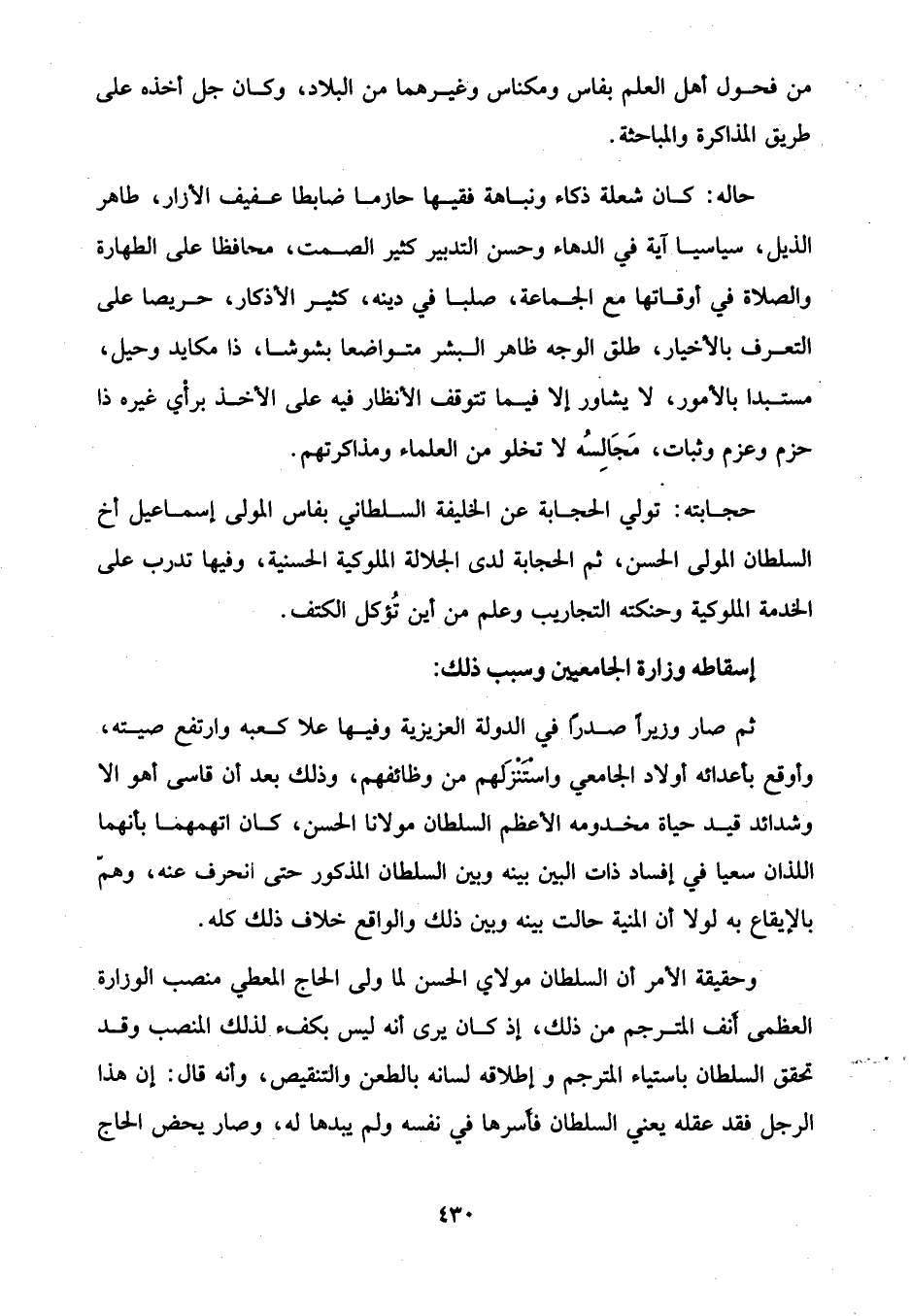 حاله: كان شعلة ذكاء ونباهة فقيها حازما ضابطا عفيف الأزار، طاهر الذيل، سياسيا آية في الدهاء وحسن التدبير كثير الصمت، محافظا على الطهارة والصلاة في أوقاتها مع الجماعة، صلبا في دينه، كثير الأذكار، حريصا على التعرف بالأخيار، طلق الوجه ظاهر البشر متواضعا بشوشا، ذا مكايد وحيل، مستبدا بالأمور، لا يشاور إلا فيما تتوقف الأنظار فيه على الأخذ برأْي غيره ذا حزم وعزم وثبات، مَجَالِسُه لا تخلو من العلماء ومذاكرتهم.