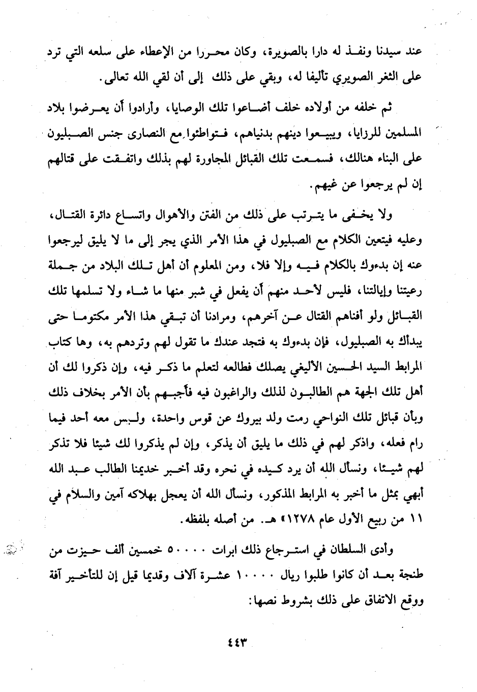 ولا يخفى ما يترتب على ذلك من الفتن والأهوال واتساع دائرة القتال، وعليه فيتعين الكلام مع الصبليول في هذا الأمر الذي يجر إلى ما لا يليق ليرجعوا عنه إن بدءوك بالكلام فيه وإلا فلا، ومن المعلوم أن أهل تلك البلاد من جملة رعيتنا وإيالتنا، فليس لأحد منهمَ أن يفعل في شبر منها ما شاء ولا تسلمها تلك القبائل ولو أفناهم القتال عن آخرهم، ومرادنا أن تبقي هذا الأمر مكتوما حتى يبدأك به الصبليول، فإن بدءوك به فتجد عندك ما تقول لهم وتردهم به، وها كتاب المرابط السيد الحسين الأليغي يصلك فطالعه لتعلم ما ذكر فيه، وإن ذكروا لك أن أهل تلك الجهة هم الطالبون لذلك والراغبون فيه فأجبهم بأن الأمر بخلاف ذلك وبأن قبائل تلك النواحي رمت ولد بيروك عن قوس واحدة، وليس معه أحد فيما رام فعله، واذكر لهم في ذلك ما يليق أن يذكر، وإن لم يذكروا لك شيئًا فلا تذكر لهم شيئًا، ونسأل الله أن يرد كيده في نحره وقد أخبر خديمنا الطالب عبد الله أبهي بمثل ما أخبر به المرابط المذكور، ونسأل الله أن يعجل بهلاكه آمين والسلام في 11 من ربيع الأول عام 11278 هـ. من أصله بلفظه.