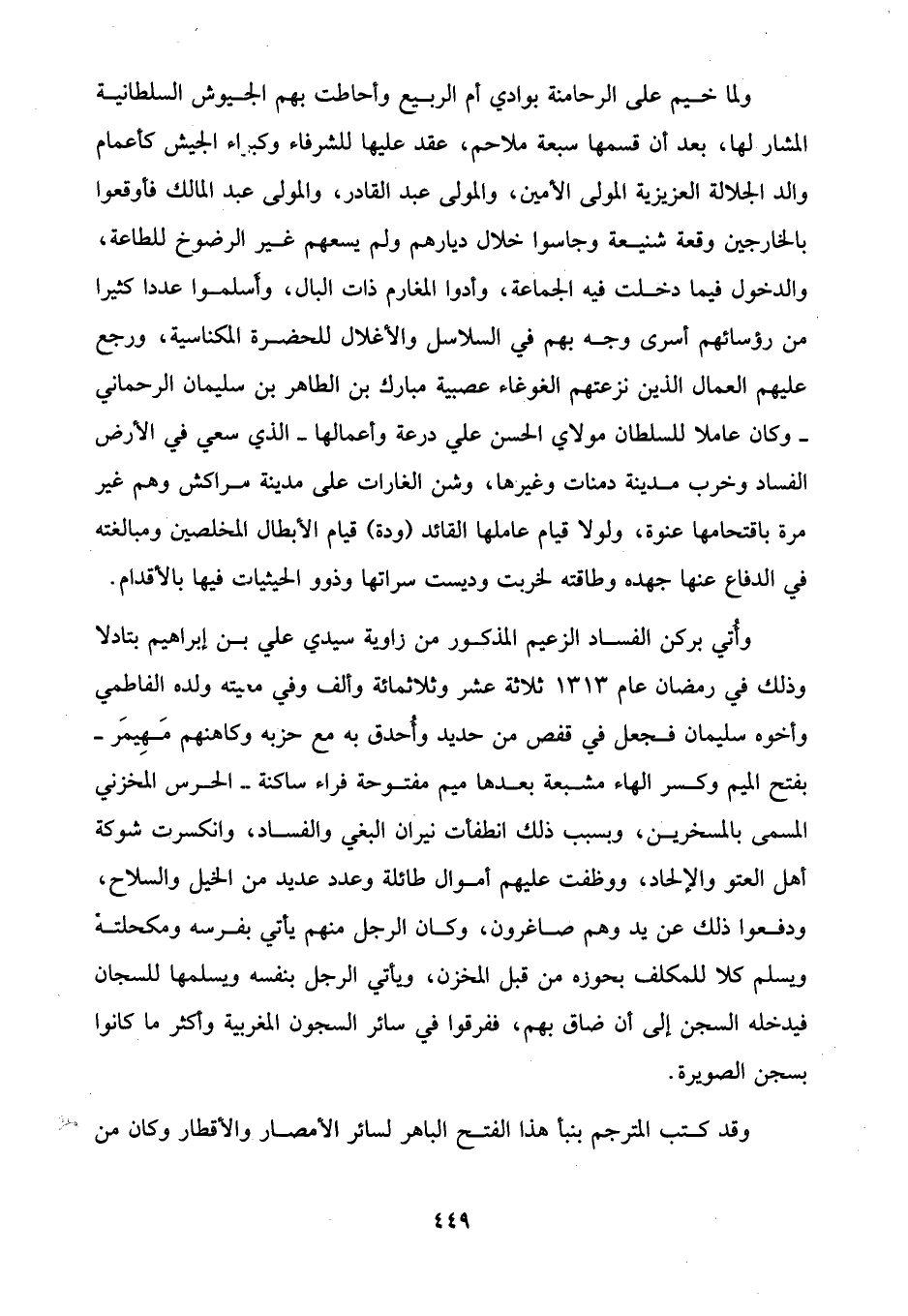 وأتي بركن الفساد الزعيم المذكور من زاوية سيدي على بن إبراهيم بتادلا وذلك في رمضان عام 1313 ثلاثة عشر وثلاثمائة وألف وفي معيته ولده الفاطمي وأخوه سليمان فجعل في قفص من حديد وأُحدق به مع حزبه وكاهنهم مَهِيمَر -بفتح الميم وكسر الهاء مشبعة بعدها ميم مفتوحة فراء ساكنة- الحرس المخزني المسمى بالمسخرين، وبسبب ذلك انطفأت نيران البغي والفساد، وانكسرت شوكة أهل العتو والإلحاد، ووظفت عليهم أموال طائلة وعدد عديد من الخيل والسلاح، ودفعوا ذلك عن يد وهم صاغرون، وكان الرجل منهم يأتي بفرسه ومكحلته ويسلم كلا للمكلف بحوزه من قبل المخزن، ويأتي الرجل بنفسه ويسلمها للسجان فيدخله السجن إلى أن ضاق بهم، ففرقوا في سائر السجون المغربية وأكثر ما كانوا بسجن الصويرة.