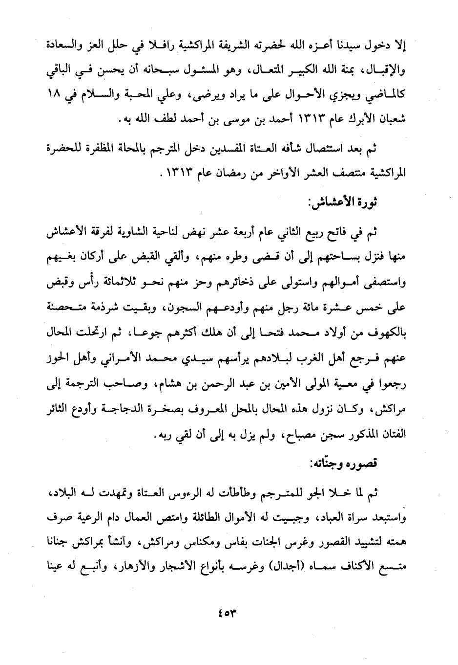 إلا دخول سيدنا أعزه الله لحضرته الشريفة المراكشية رافلا في حلل العز والسعادة والإقبال، بمنة الله الكبير المتعال، وهو المسئول سبحانه أن يحسن في الباقي كالماضي ويجزي الأحوال على ما يراد ويرضى، وعلي المحبة والسلام في 18 شعبان الأبرك عام 1313 أحمد بن موسى بن أحمد لطف الله به.