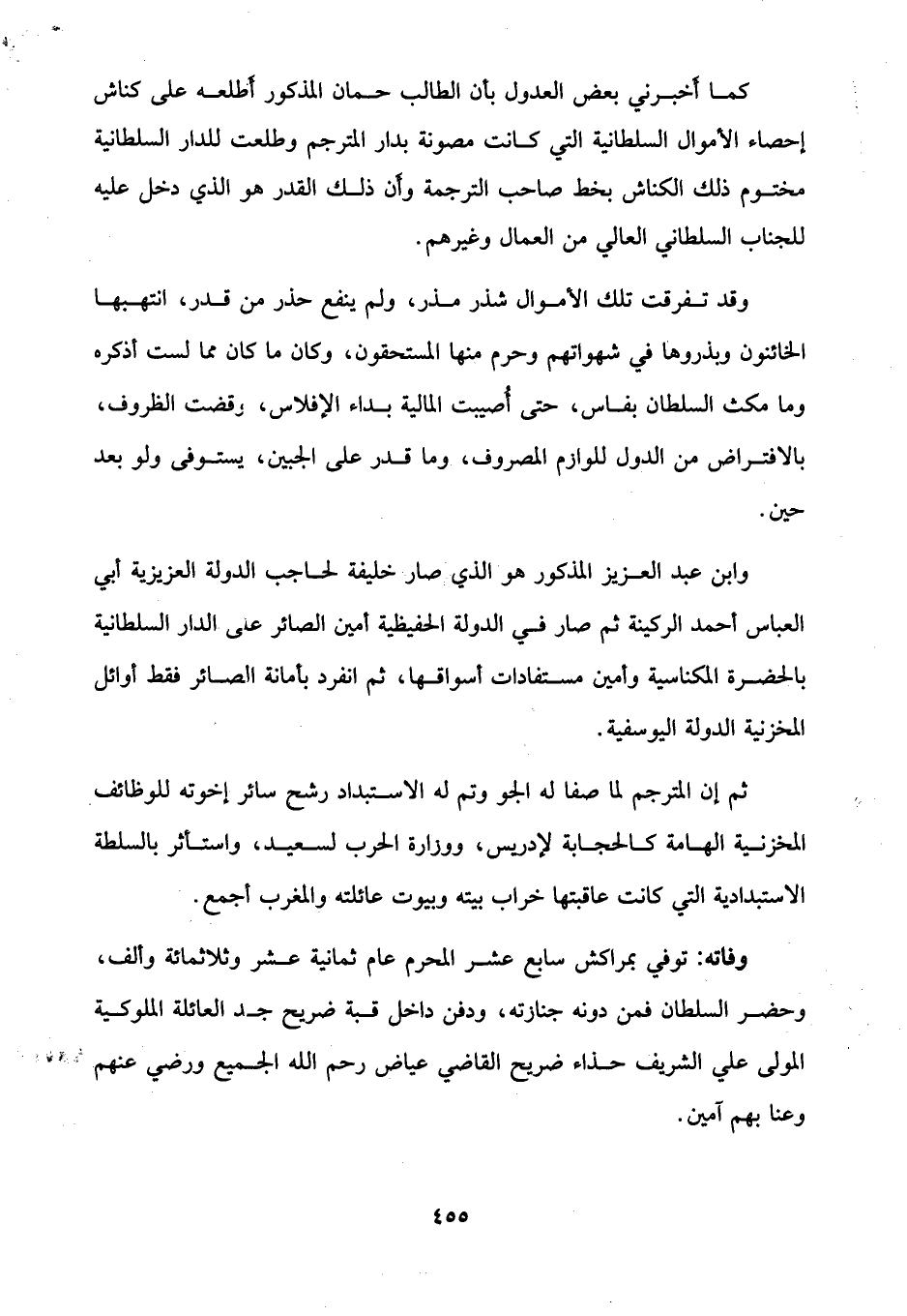 كما أخبرني بعض العدول بأن الطالب حمان المذكور أظلعه على كناش إحصاء الأموال السلطانية التي كانت مصونة بدار المترجم وطلعت للدار السلطانية مختوم ذلك الكناش بخط صاحب الترجمة وأن ذلك القدر هو الذي دخل عليه للجناب السلطاني العالي من العمال وغيرهم.