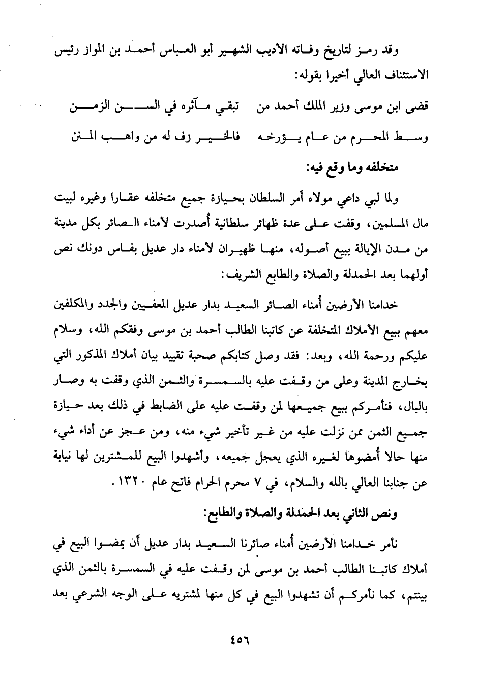 خدامنا الأرضين أمناء الصائر السعيد بدار عديل المعفيين والجدد والمكلفين معهم ببيع الأملاك المتخلفة عن كاتبنا الطالب أحمد بن موسى وفقكم الله، وسلام عليكم ورحمة الله، وبعد: فقد وصل كتابكم صحبة تقييد بيان أملاك المذكور التي بخارج المدينة وعلى من وقفت عليه بالسمسرة والثمن الذي وقفت به وصار بالبال، فنأمركم ببيع جميعها لمن وقفت عليه على الضابط في ذلك بعد حيازة جميع الثمن ممن نزلت عليه من غير تأخير شيء منه، ومن عجز عن أداء شيء منها حالا أمضوها لغيره الذي يعجل جميعه، وأشهدوا البيع للمشترين لها نيابة عن جنابنا العالي بالله والسلام، في 7 محرم الحرام فاتح عام 1320.