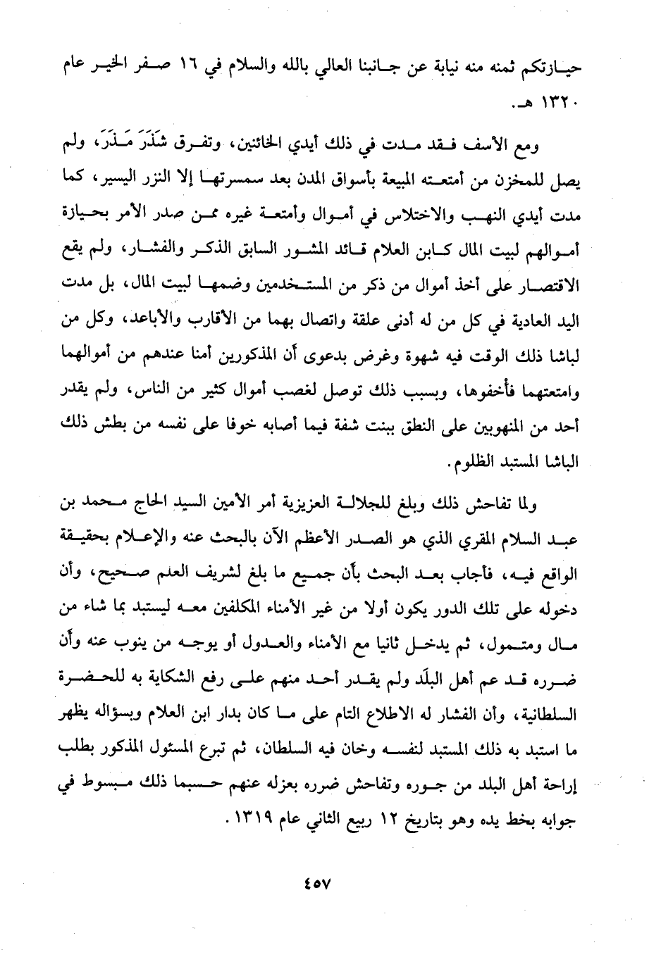 ولما تفاحش ذلك وبلغ للجلالة العزيزية أمر الأمين السيد الحاج محمَّد بن عبد السلام المقري الذي هو الصدر الأعظم الآن بالبحث عنه والإعلام بحقيقة الواقع فيه، فأجاب بعد البحث بأن جميع ما بلغ لشريف العلم صحيح، وأن دخوله على تلك الدور يكون أولًا من غير الأمناء المكلفين معه ليستبد بما شاء من مال ومتمول، ثم يدخل ثانيا مع الأمناء والعدول أو يوجه من ينوب عنه وأن ضرره قد عم أهل البلَد ولم يقدر أحد منهم على رفع الشكاية به للحضرة السلطانية، وأن الفشار له الاطلاع التام على ما كان بدار ابن العلام وبسؤاله يظهر ما استبد به ذلك المستبد لنفسه وخان فيه السلطان، ثم تبرع المسئول المذكور بطلب إراحة أهل البلد من جوره وتفاحش ضرره بعزله عنهم حسبما ذلك مبسوط في جوابه بخط يده وهو بتاريخ 12 ربيع الثاني عام 1319.