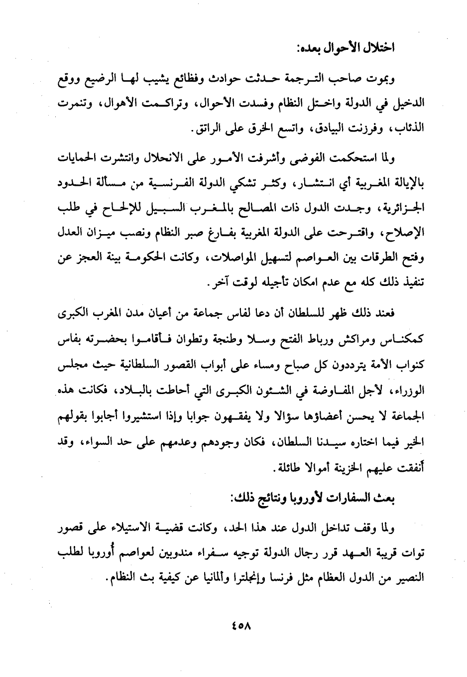 ولما استحكمت الفوضى وأشرفت الأمور على الانحلال وانتشرت الحمايات بالإيالة المغربية أي انتشار، وكثر تشكي الدولة الفرنسية من مسألة الحدود الجزائرية، وجدت الدول ذات المصالح بالمغرب السبيل للإلحاح في طلب الإصلاح، واقترحت على الدولة المغربية بفارغ صبر النظام ونصب ميزان العدل وفتح الطرقات بين العواصم لتسهيل المواصلات، وكانت الحكومة بينة العجز عن تنفيذ ذلك كله مع عدم إمكان تأجيله لوقت آخر.
