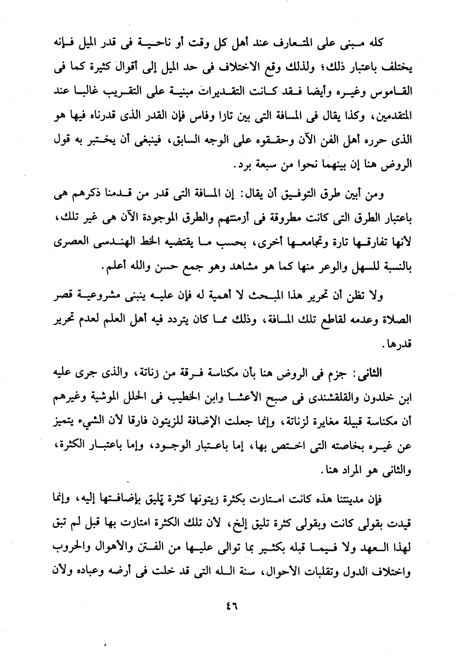 ولا تظن أن تحرير هذا المبحث لا أهمية له فإن عليه ينبنى مشروعية قصر الصلاة وعدمه لقاطع تلك المسافة، وذلك مما كان يتردد فيه أهل العلم لعدم تحرير قدرها.