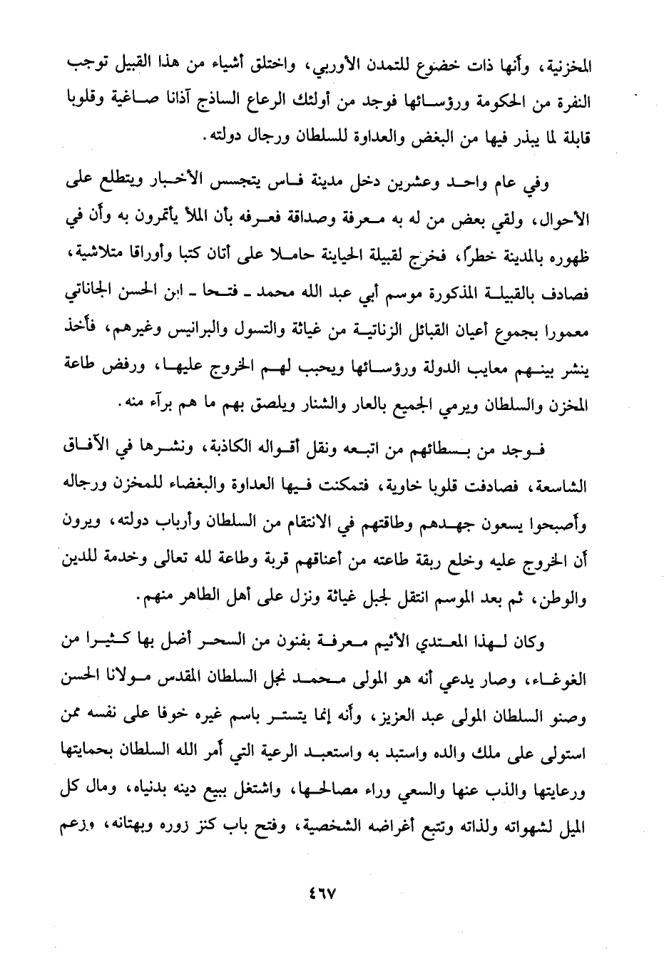 المخزنية، وأنها ذات خضوع للتمدن الأوربي، واختلق أشياء من هذا القبيل توجب النفرة من الحكومة ورؤسائها فوجد من أولئك الرعاع الساذج آذانا صاغية وقلوبا قابلة لما يبذر فيها من البغض والعداوة للسلطان ورجال دولته.